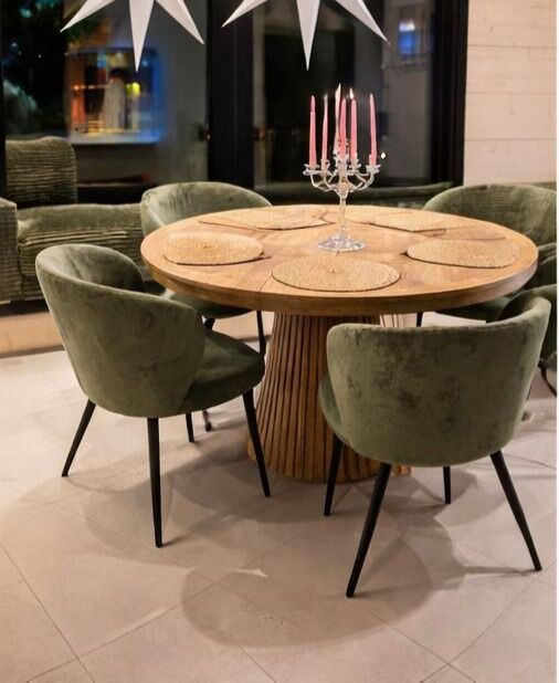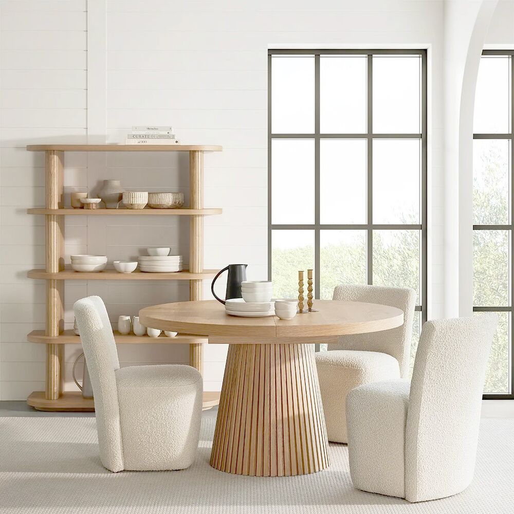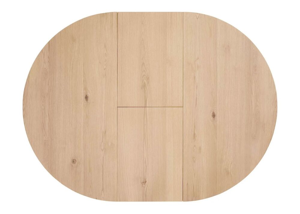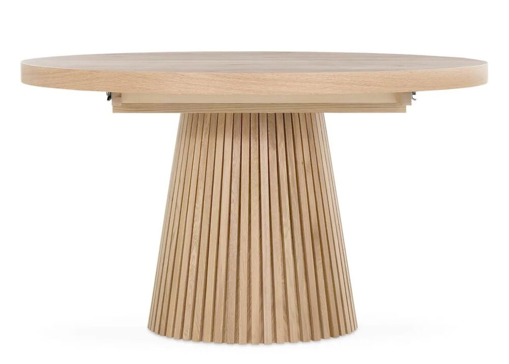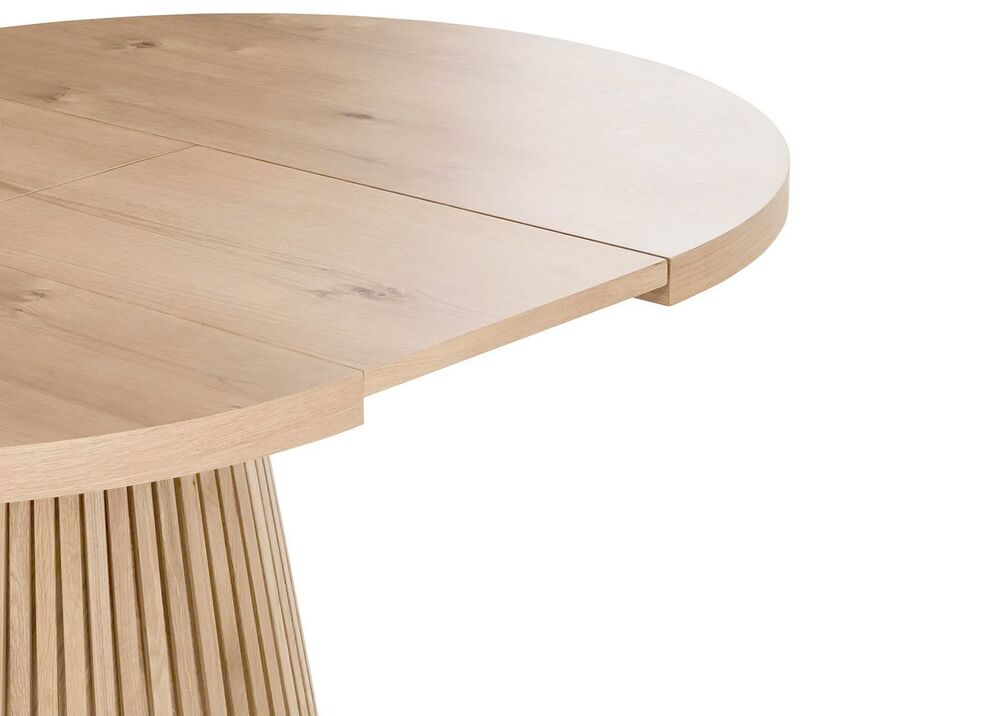 Huipputyylikäs rimatyylinen valkaistu tamminen jatkettava Alppi ruokapöytä jonka kannen halkaisija on 130cm. Jatkettuna pöydän pituus 170cm.