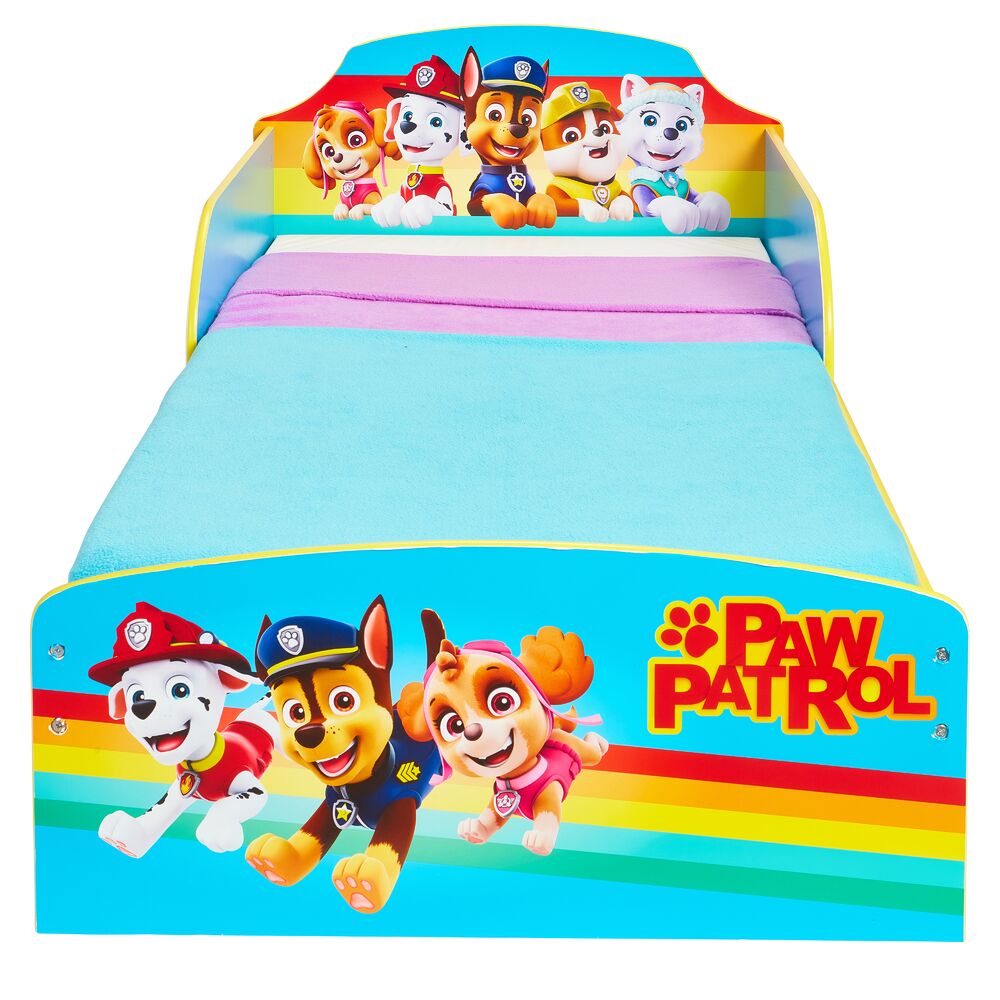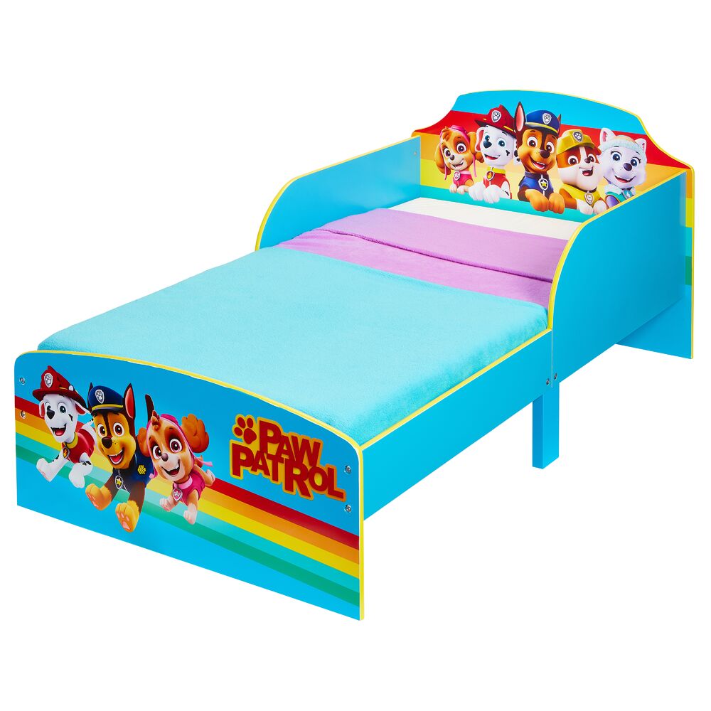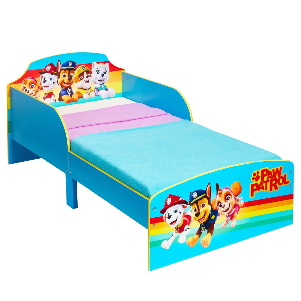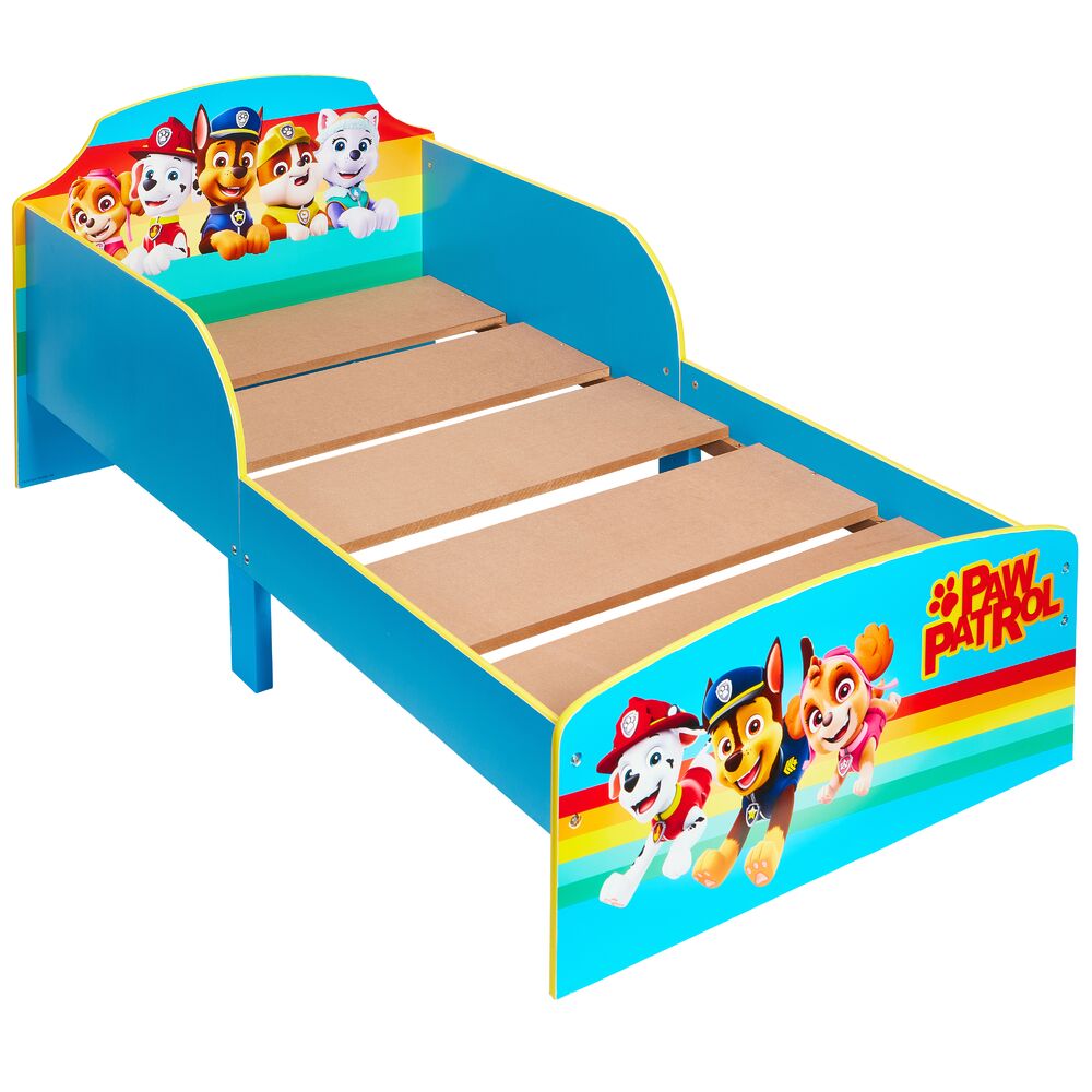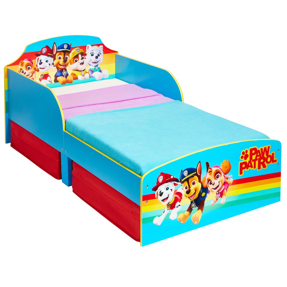 Hieno Ryhmä Hau aiheinen "Paw Patrol" lastensänky, jonka alla kätevät kankaiset säilytyslaatikot Valmistettu MDF-levystä. Sängyn pohjana 23cm leveät ja 16mm vahvat tukevat mdf-levypohjat joita sängyssä 5kpl. Levyjen välissä noin 5cm leveät tuuletusraot.