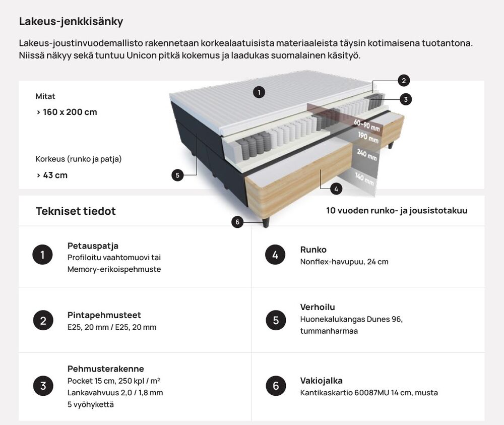 Kotimainen Unicon valmistama myötäilevällä pussijousituksella varustettu jenkkisänky. Keskipehmeän jenkkisängyn ystävälle.