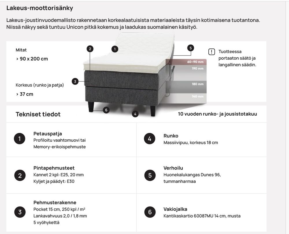 Kotimainen Unicon valmistama myötäilevällä pussijousituksella varustettu Lakeus moottorisänky koossa 90x200cm. Keskipehmeän moottorisängyn ystävälle.