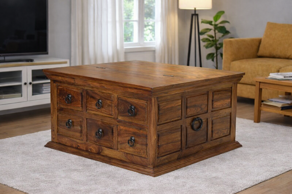 Kaunis acaziasta valmistettu arkkusohvapöytä kuudella vetolaatikolla