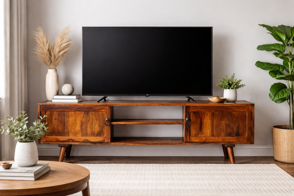 Tämä tukeva TV-taso on käsityönä valmistettu akaasiapuusta, joka on kasvatettu Intian valtion kontrolloimalla plantaasilla. Ovien saranat ja vetimet ovat myös takorautaa.