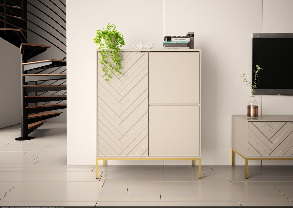 Tyylikäs kashmiren värinen kalanruotokuvioitu kaappi, jossa runsaasti säilytystilaa. Kullanväriset 20cm korkeat jalat helpottavat siivousta kaapin alta. Ovien etusarja on mdf-levyä ja siinä on tyylikäs lovetus oven avaamista varten. Ovessa olevat urat antavat kaapille tyylikkään ilmeen. Tämä upea kalanruotokuvioinen lipasto sopii moneen sisutustyyliin.