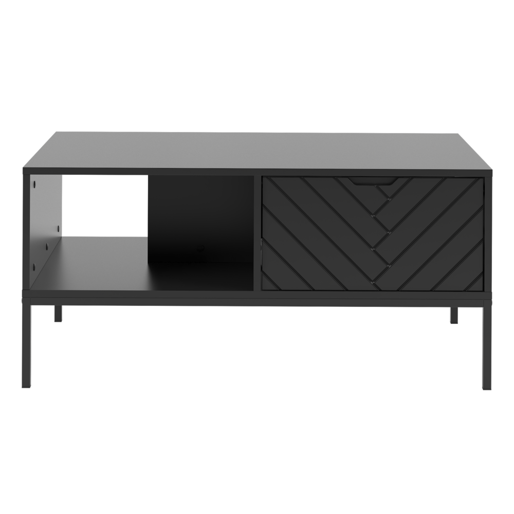 Upea mustan värinen Aspen sohvapöytä kippiovilla. Tyylikkäät 20cm korkeat mustat jalat viimeistelevät tuotteen. Ovien etusarja on mdf-levyä ja siinä on tyylikäs lovetus oven avaamista varten. Ovissa olevat kalanruotokuvioidut urat antavat pöydälle tyylikkään ilmeen