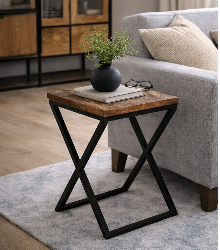 Kaunis kierrätyspuusta valmistettu pikkupöytä vaikka kukka-alustaksi tai yöpöydäksi. Tuotteen jalat valmistettu metallista.