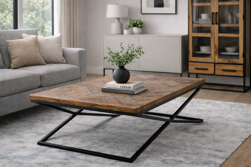 Monisävyinen kalanruotokuviotu kierrätyspuu on kiinnitetty metallirunkoon mdf-levyn päälle. Tämä upea kalanruotopöytä sopii monenlaiseen sisustustyyliin.