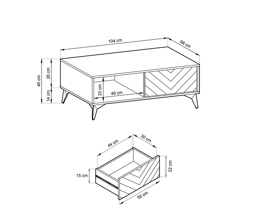 to-open –mekanismi. Sohvapöydän leveys on 103,5 cm, syvyys 68 cm ja korkeus 39,5 cm. Toimitus