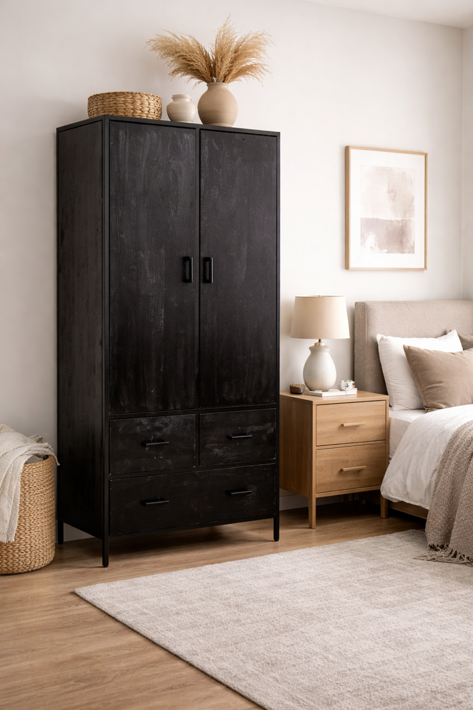 Tämä musta vaatekaappi on valmistettu massiviipuusta. Jalat metallia. Ovikaappien takana tilavat kiinteät hyllyt 2kpl. Tuotteessa lisäksi yksi iso ja kaksi pientä vetolaatikkoa.