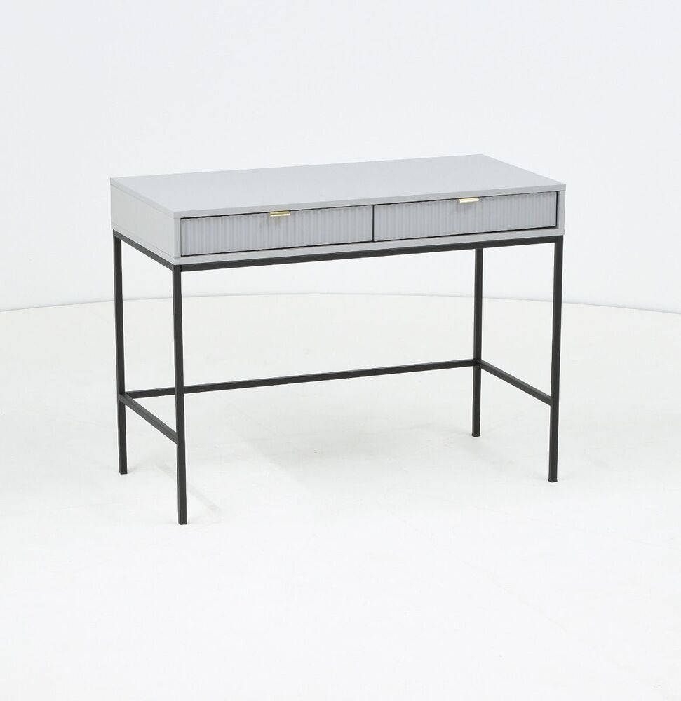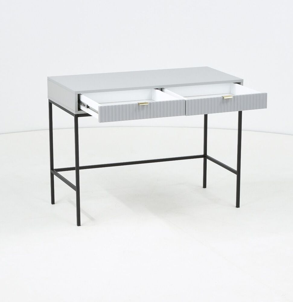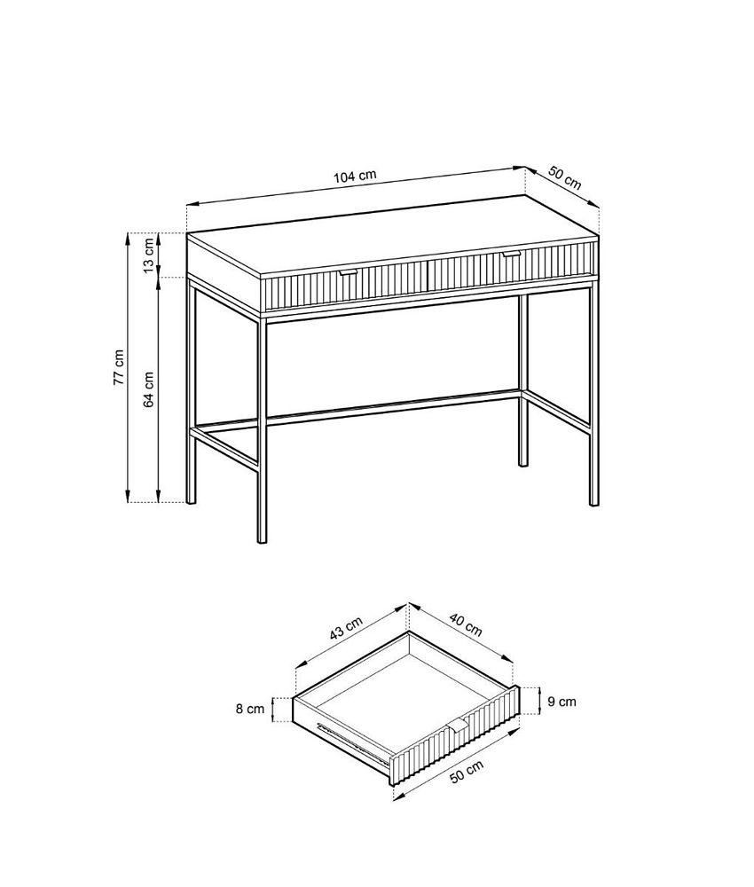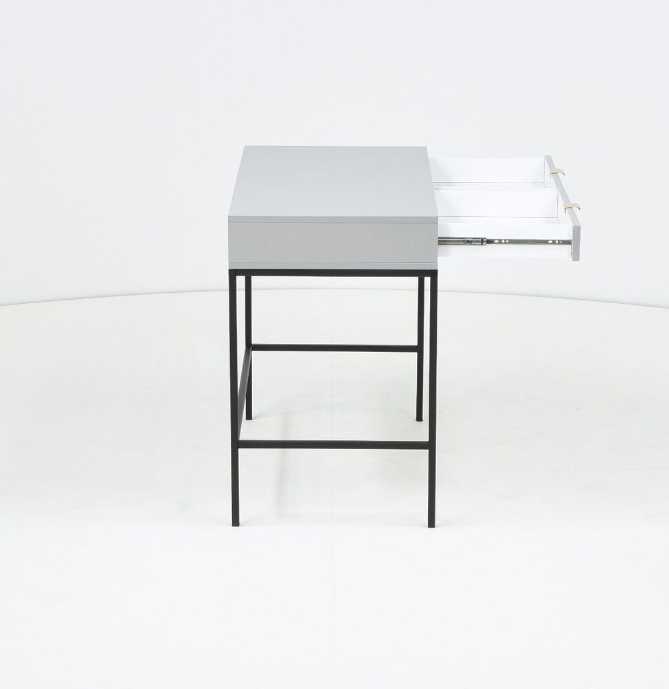 Latte-kirjoituspöytä on osa laajaa Lattemallistoa., Tuottessa on kaksi vetolaatikkoa. Kirjoituspöydän runko on 16 mm paksua laminoitua kalustelevyä, jossa on ABS-reunanauha. Mustat jalat ovat metallia ja niiden korkeus on 65 cm. Laatikoiden etusarjat ovat 18 mm paksua mdf-levyä ja niissä on harjatut kullanväriset alumiinivetimet. Etusarjoissa olevat urat antavat kirjoituspöydälle kauniin, yksilöllisen ilmeen.