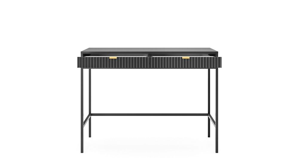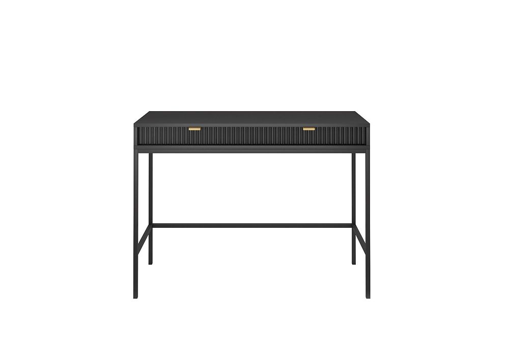 Tyylikäs ja siro mustan värinen Latte-kirjoituspöytä, jossa on kaksi vetolaatikkoa. Kirjoituspöydän runko on 16 mm paksua laminoitua kalustelevyä, jossa on ABS-reunanauha. Mustat jalat ovat metallia ja niiden korkeus on 65 cm. Laatikoiden etusarjat ovat 18 mm paksua mdf-levyä ja niissä on harjatut kullanväriset alumiinivetimet. Etusarjoissa olevat urat antavat kirjoituspöydälle kauniin, yksilöllisen ilmeen.