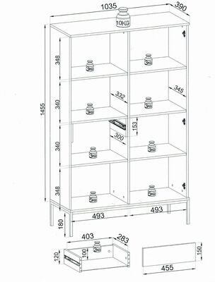 Moderni ja tyylikäs Mooa-vitriini, jonka upeana yksityiskohtana on lämpimän sävyinen LED-valaistus. Vitriinissä on kaksi kaappia, joissa molemmissa kolme välihyllyä. Vitriinin lasioven takana on myös laatikko, jossa on täysin aukeavat liukukiskot (Häfele). Vitriinin musta runko on 16 mm paksua laminoitua kalustelevyä ja siinä on ABS-reunanauha. Uritetun oven etusarja on 18 mm paksua mdf-levyä ja lasiovi on 4 mm paksua karkaistua savulasia, jonka ympärillä on alumiinikehys. Ovissa on push-to-open -mekanismi (Titus) sekä Häfelen saranat. Jalat ovat mustaksi pulverimaalattua metallia ja niiden korkeus on 18 cm. LED-valossa on 6 m pitkä virtajohto, 12V muuntaja sekä erillinen virtakytkin, jonka avulla valaistus on helppo laittaa päälle ja pois. Tässä tuotteessa on myös mahdollista valita, kummalle puolella vitriiniä haluaa asentaa lasioven ja valaistuksen.