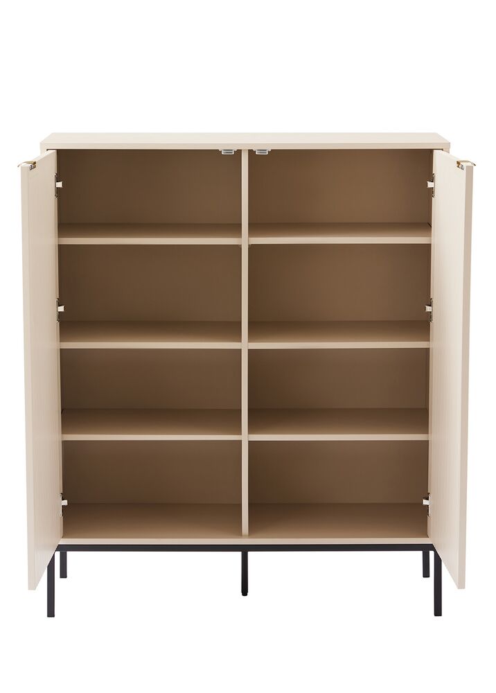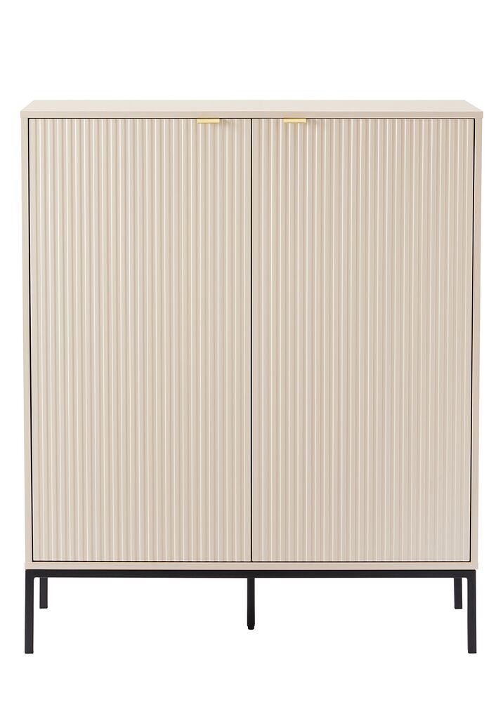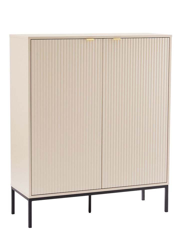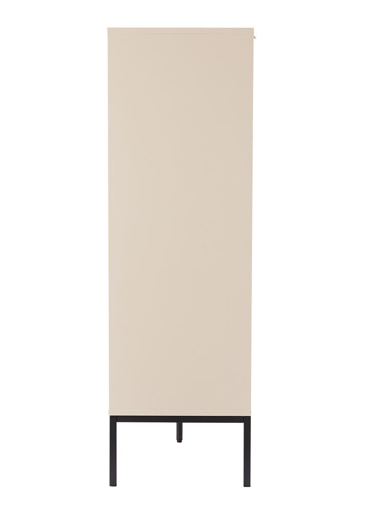 Tyylikäs ja siro beige Raita-kaappi, josta löytyy tilavat säätöhyllyt. Kaapissa on väliseinän molemmin puolin kolme välihyllyä. Kaapin runko laminoitua kalustelevyä, jossa on ABS-reunanauha. Mustat jalat ovat metallia. Ovien etusarjat ovat mdf-levyä ja niissä on harjatut kullanväriset alumiinivetimet. Etusarjoissa olevat urat antavat lipastolle kauniin, yksilöllisen ilmeen.