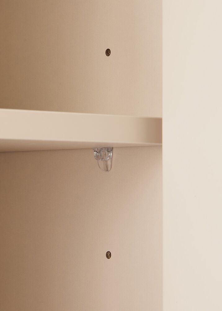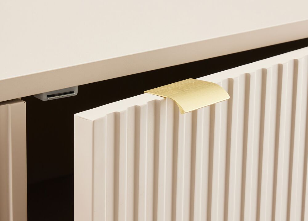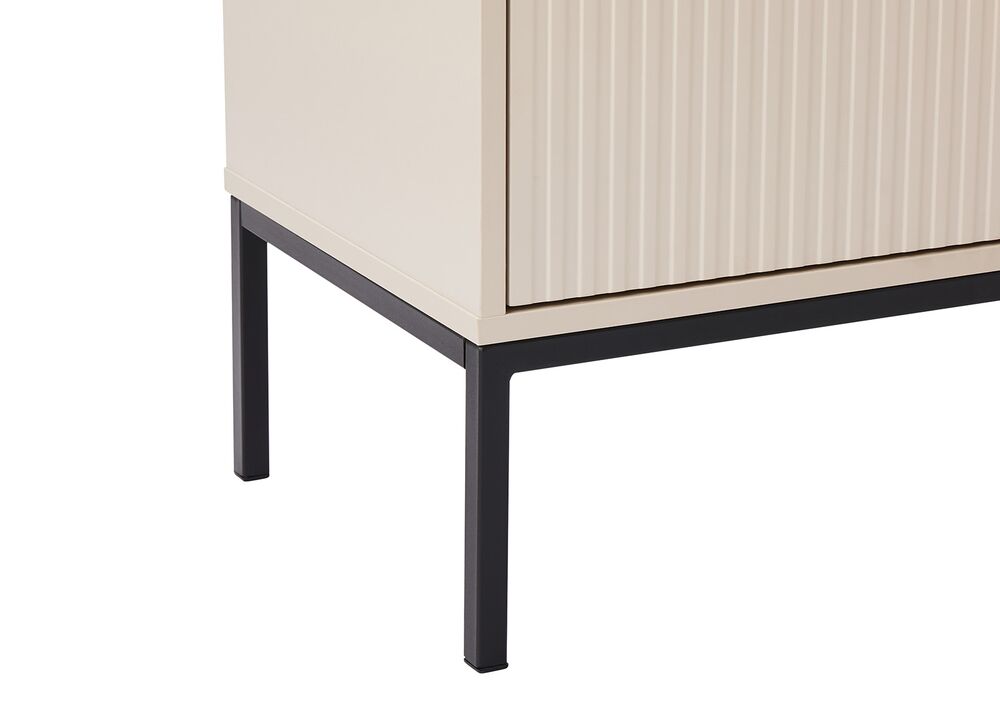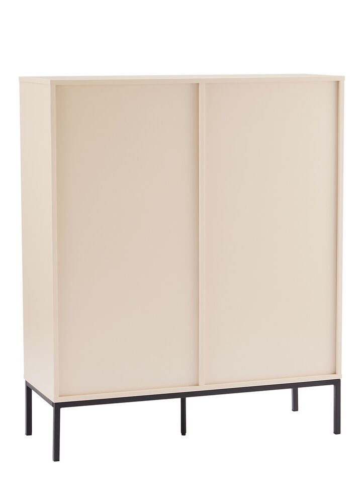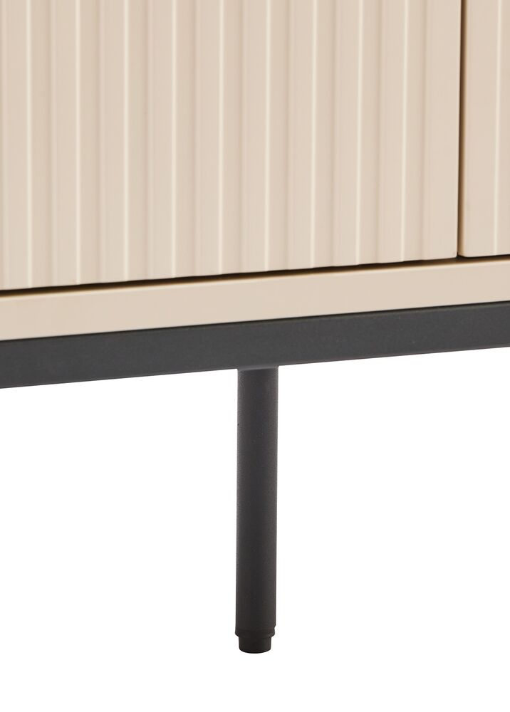 Tyylikäs ja siro beige Raita-kaappi, josta löytyy tilavat säätöhyllyt. Kaapissa on väliseinän molemmin puolin kolme välihyllyä. Kaapin runko laminoitua kalustelevyä, jossa on ABS-reunanauha. Mustat jalat ovat metallia. Ovien etusarjat ovat mdf-levyä ja niissä on harjatut kullanväriset alumiinivetimet. Etusarjoissa olevat urat antavat lipastolle kauniin, yksilöllisen ilmeen.