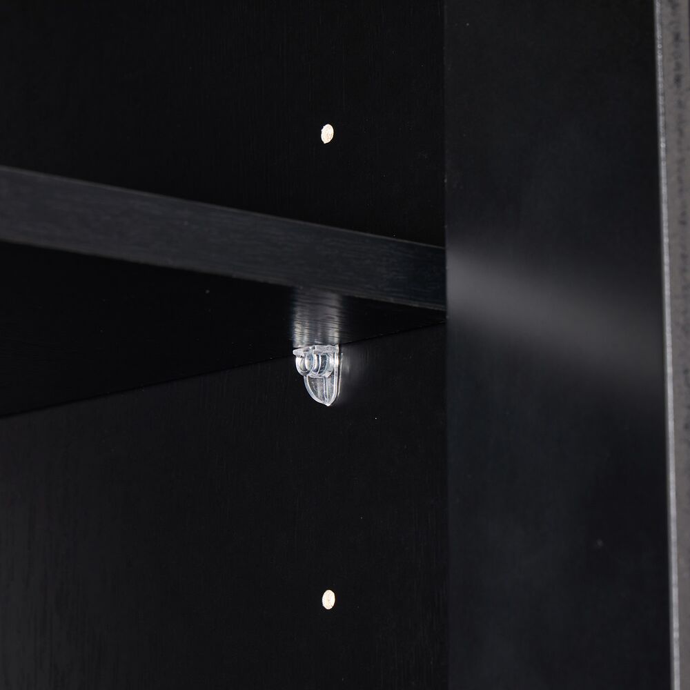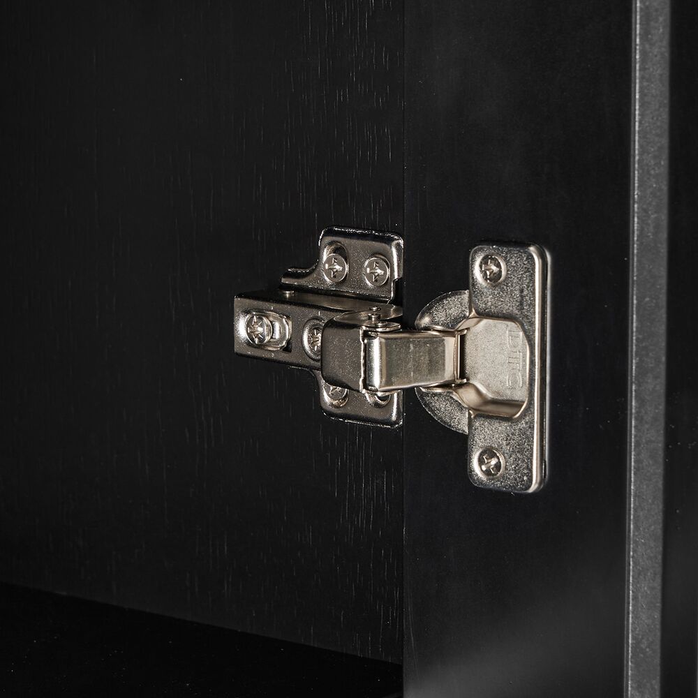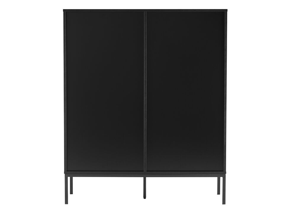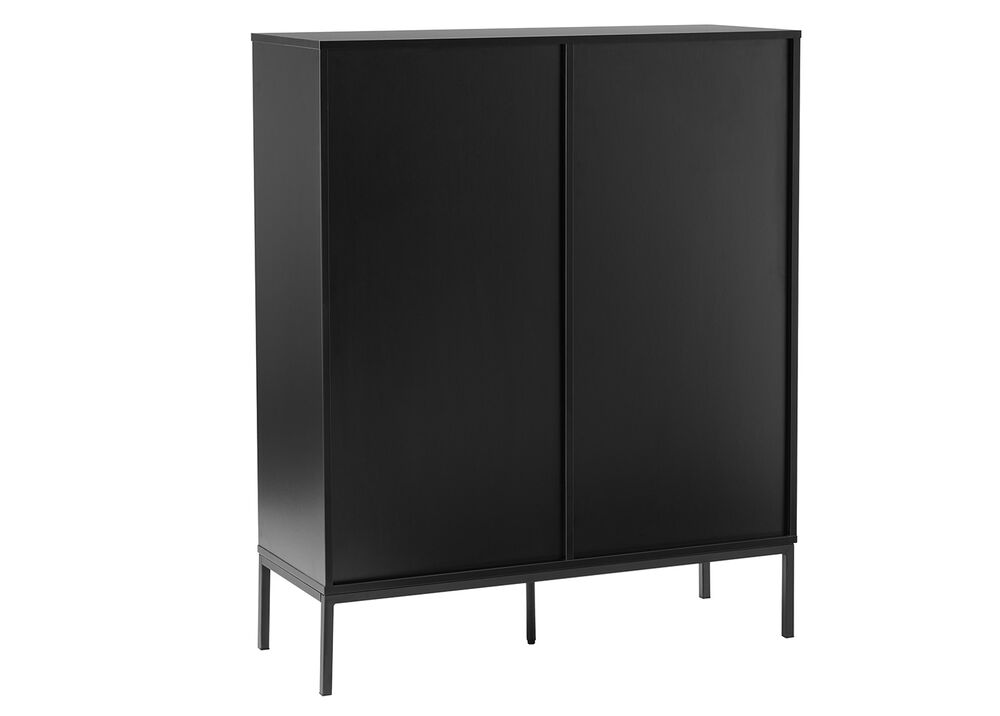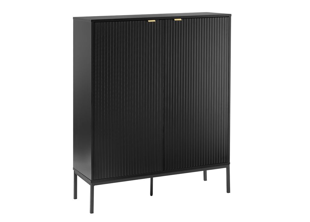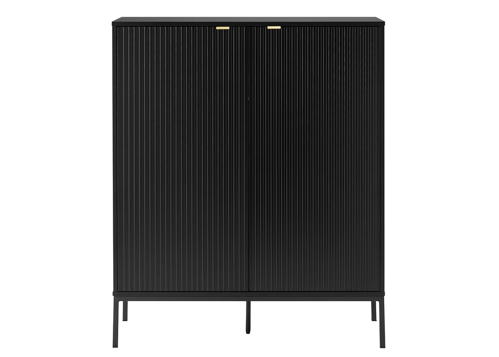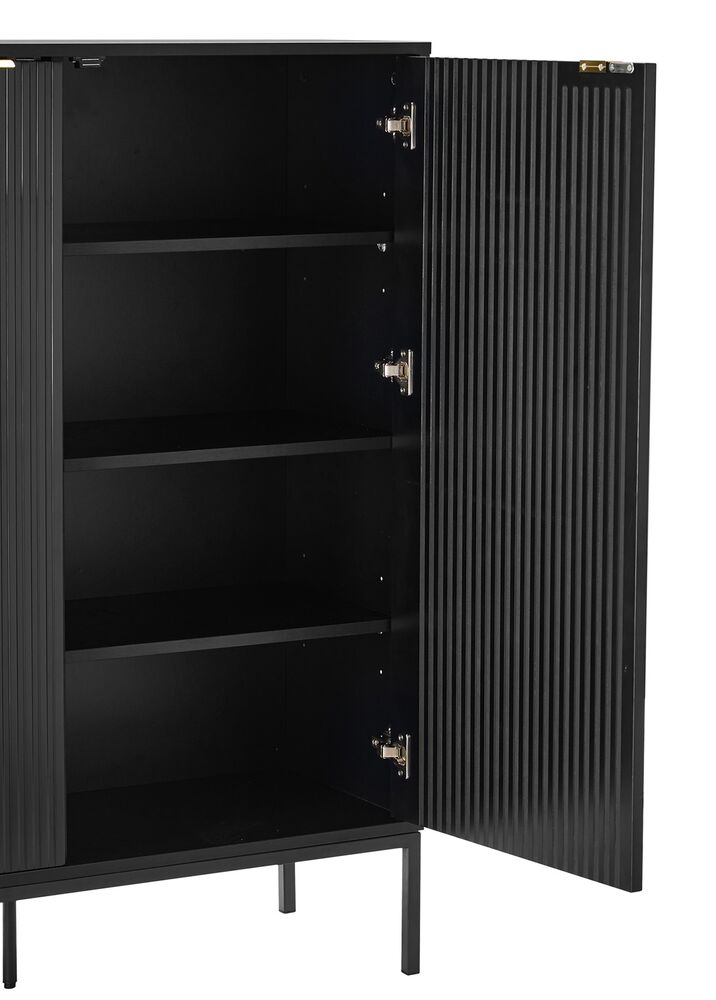 Tyylikäs ja siro musta Raita-kaappi, josta löytyy tilavat säätöhyllyt. Kaapissa on väliseinän molemmin puolin kolme välihyllyä. Kaapin runko laminoitua kalustelevyä, jossa on ABS-reunanauha. Mustat jalat ovat metallia. Ovien etusarjat ovat mdf-levyä ja niissä on harjatut kullanväriset alumiinivetimet. Etusarjoissa olevat urat antavat lipastolle kauniin, yksilöllisen ilmeen.