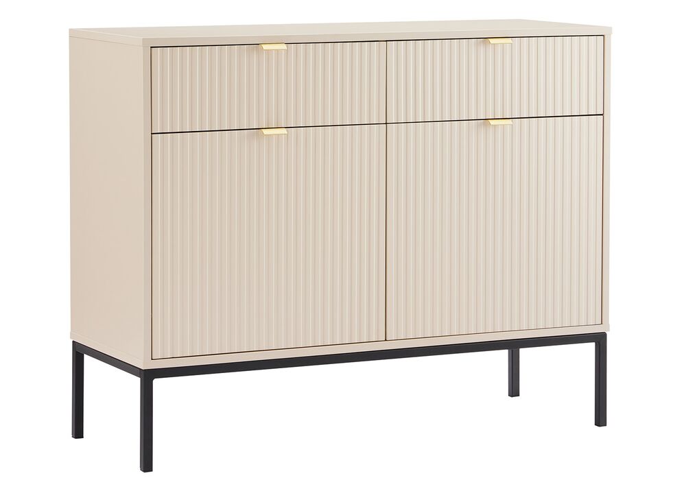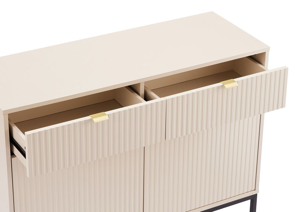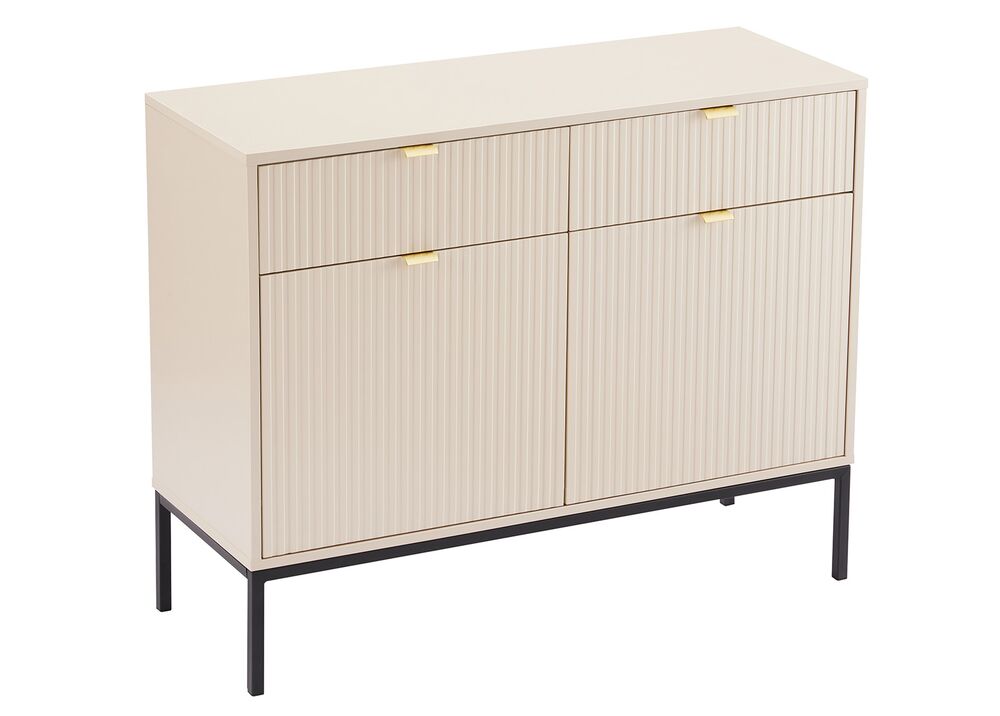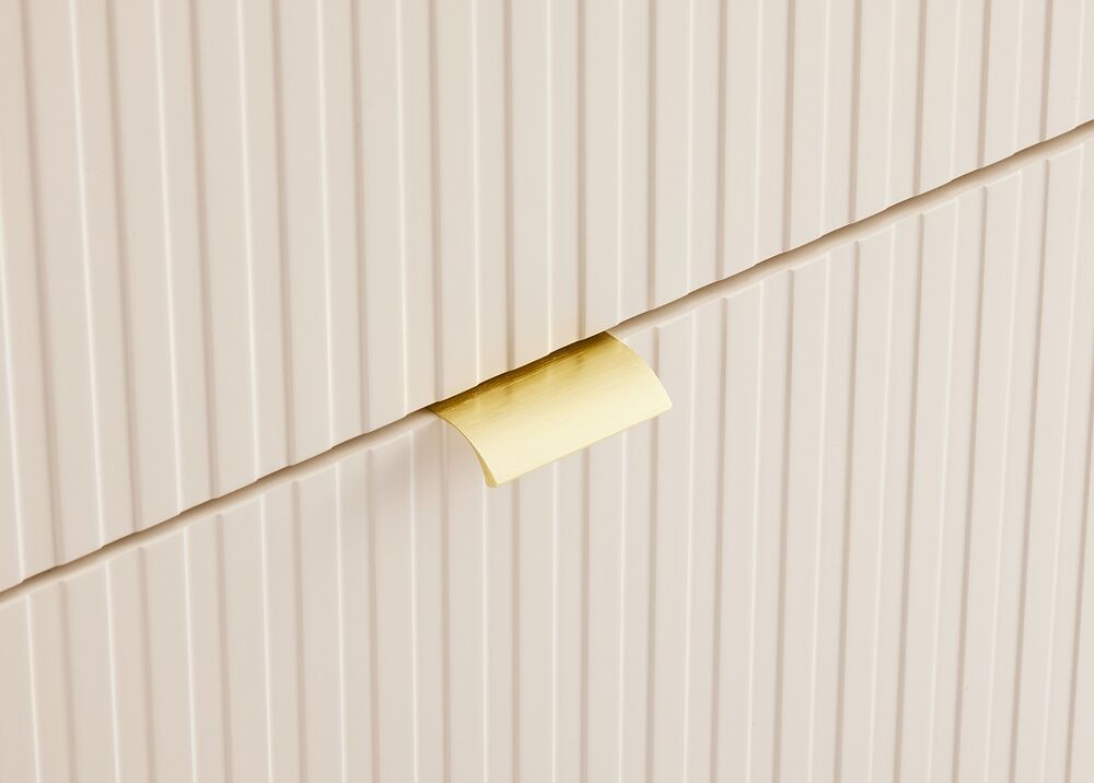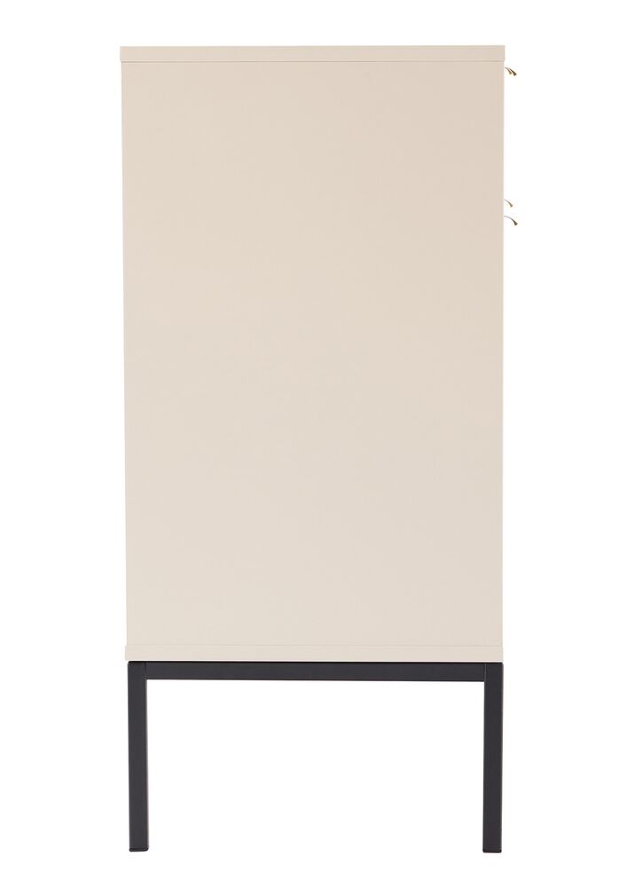 Tyylikäs ja siro beige Raita-lipasto, josta löytyy kaksi vetolaatikkoa sekä kaappi. Kaapissa on väliseinän molemmin puolin yksi välihylly. Lipaston runko laminoitua kalustelevyä, jossa on ABS-reunanauha. Mustat jalat ovat metallia. Laatikoiden ja ovien etusarjat ovat mdf-levyä ja niissä on harjatut kullanväriset alumiinivetimet. Etusarjoissa olevat urat antavat lipastolle kauniin, yksilöllisen ilmeen. Raita-lipasto on hintaystävällinen vaihtoehto, joka tuo kotiin samaa muotokieltä kuin suosittu Latte-lipasto.