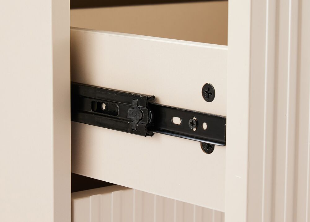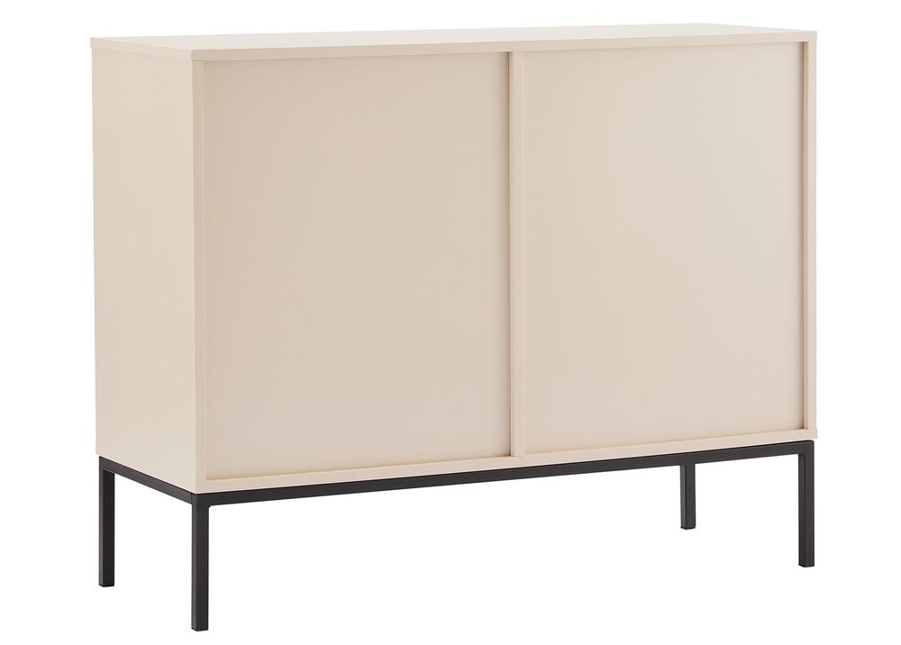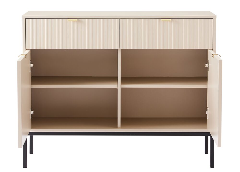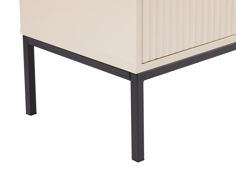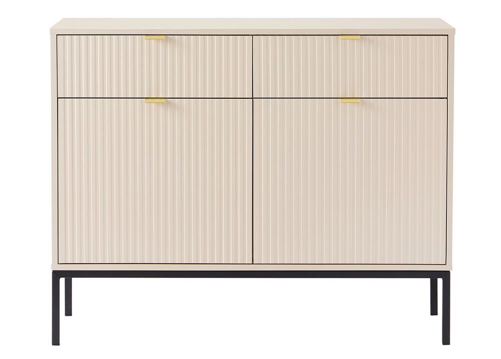 Tyylikäs ja siro beige Raita-lipasto, josta löytyy kaksi vetolaatikkoa sekä kaappi. Kaapissa on väliseinän molemmin puolin yksi välihylly. Lipaston runko laminoitua kalustelevyä, jossa on ABS-reunanauha. Mustat jalat ovat metallia. Laatikoiden ja ovien etusarjat ovat mdf-levyä ja niissä on harjatut kullanväriset alumiinivetimet. Etusarjoissa olevat urat antavat lipastolle kauniin, yksilöllisen ilmeen. Raita-lipasto on hintaystävällinen vaihtoehto, joka tuo kotiin samaa muotokieltä kuin suosittu Latte-lipasto.