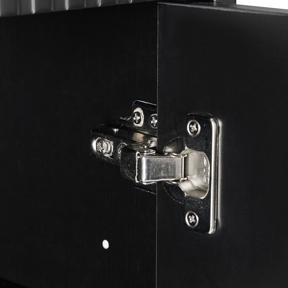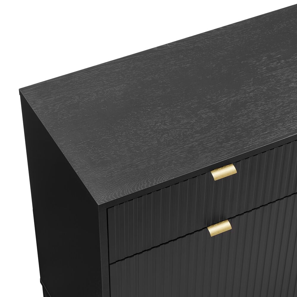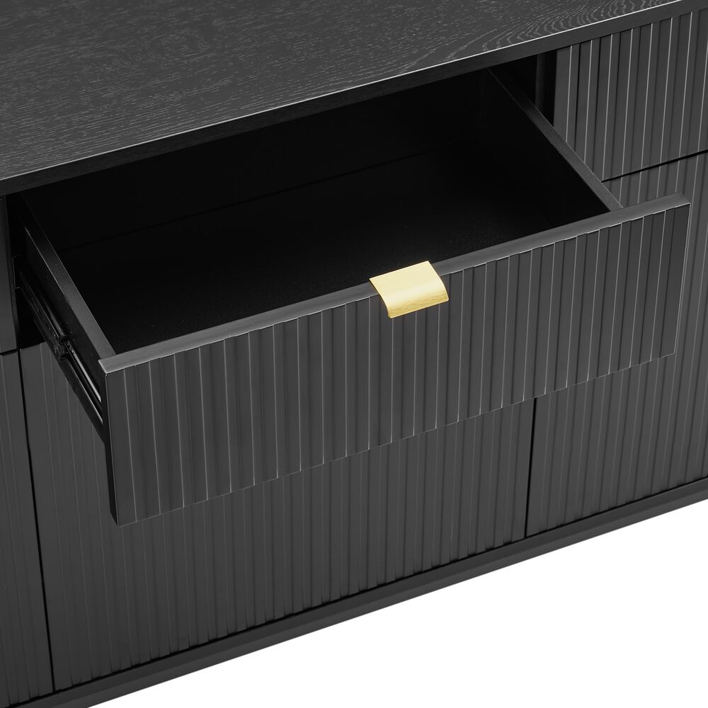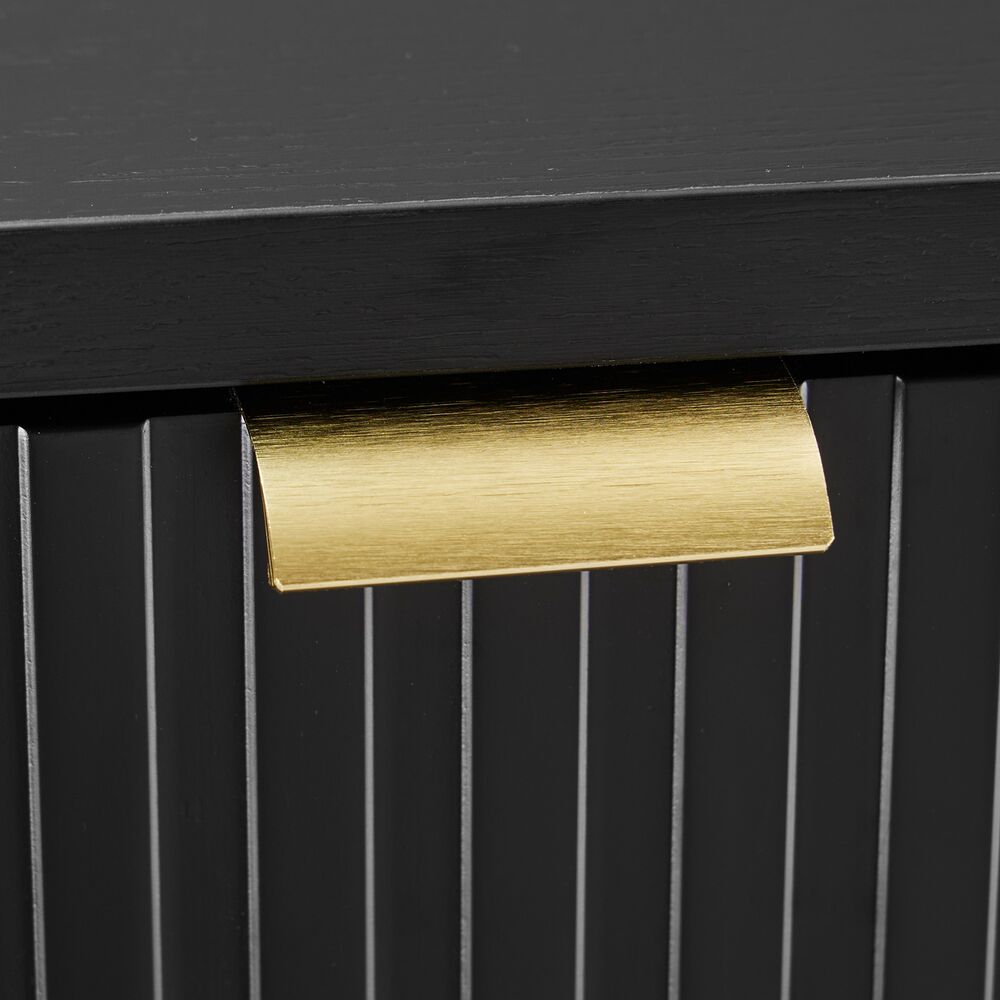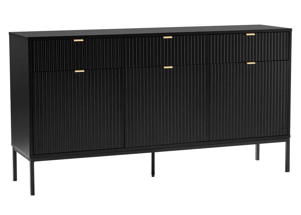Tyylikäs ja siro musta Raita-senkki, josta löytyy runsaasti säilytystilaa. Senkin runko laminoitua kalustelevyä, jossa on ABS-reunanauha. Mustat jalat ovat metallia. Ovien ja laatikoiden etusarjat ovat mdf-levyä ja niissä on harjatut kullanväriset alumiinivetimet. Etusarjoissa olevat urat antavat lipastolle kauniin, yksilöllisen ilmeen. Edullinen Raita-senkki musta yhdistää tyylin ja käytännöllisyyden. Ulkonäöltään se on samankaltainen kuin suosittu Latte-senkki.