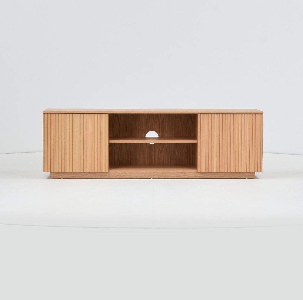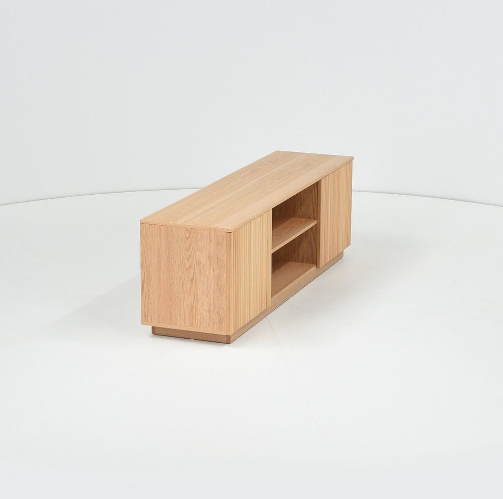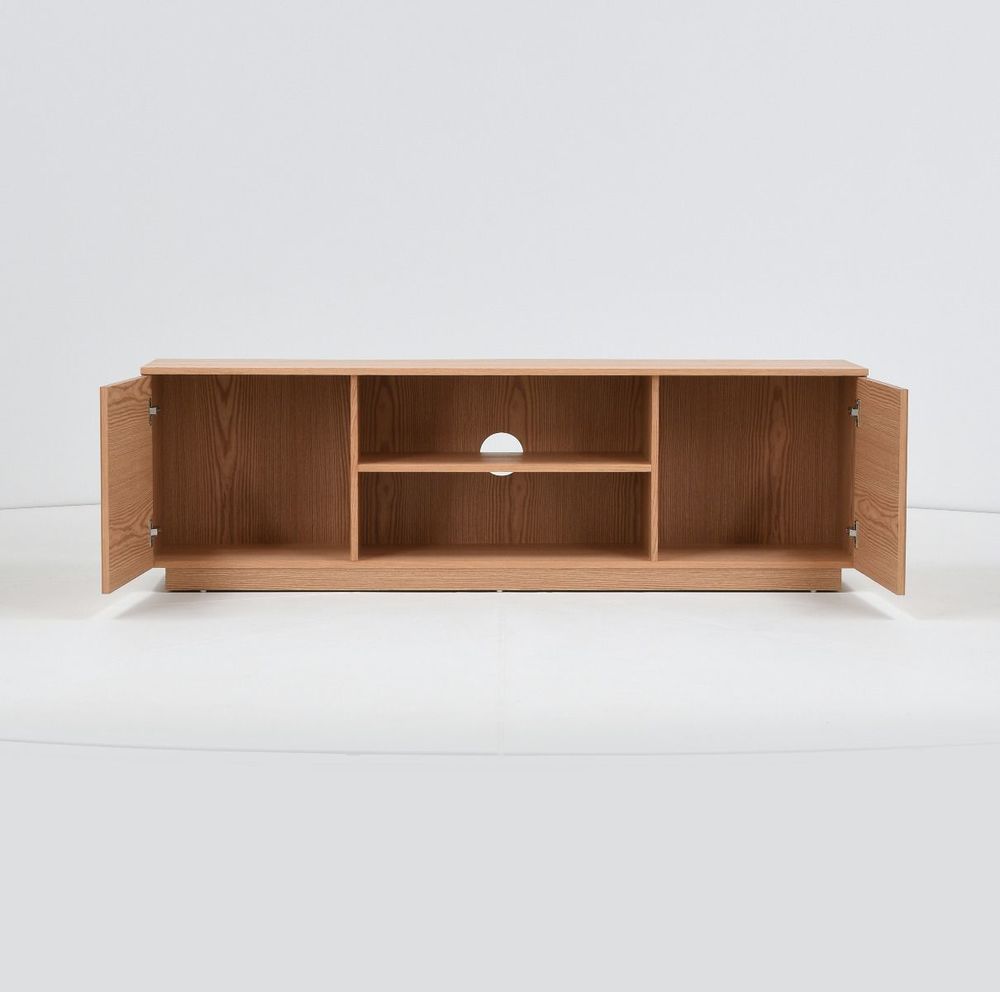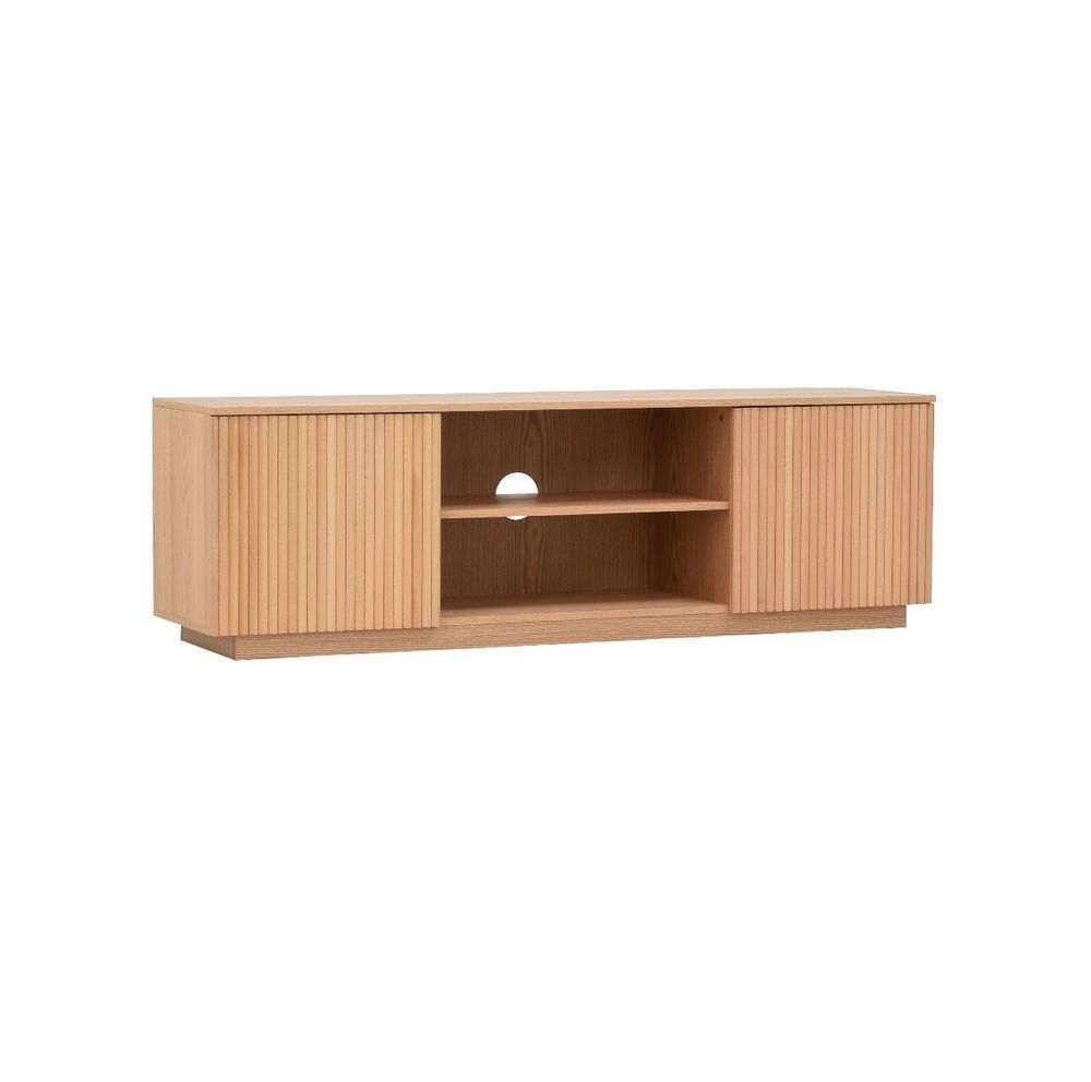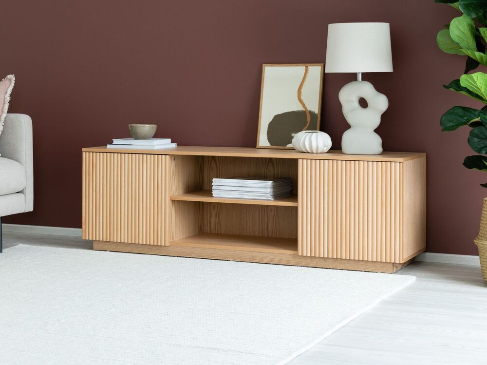 Upea, luonnonvärinen Verso tv-taso, jossa on kaksi kaappia sekä avohyllyt. Tv-tason runko on mdf-levyä ja tammiviilua ja sen ovet on koristeltu pyökkirimoilla.