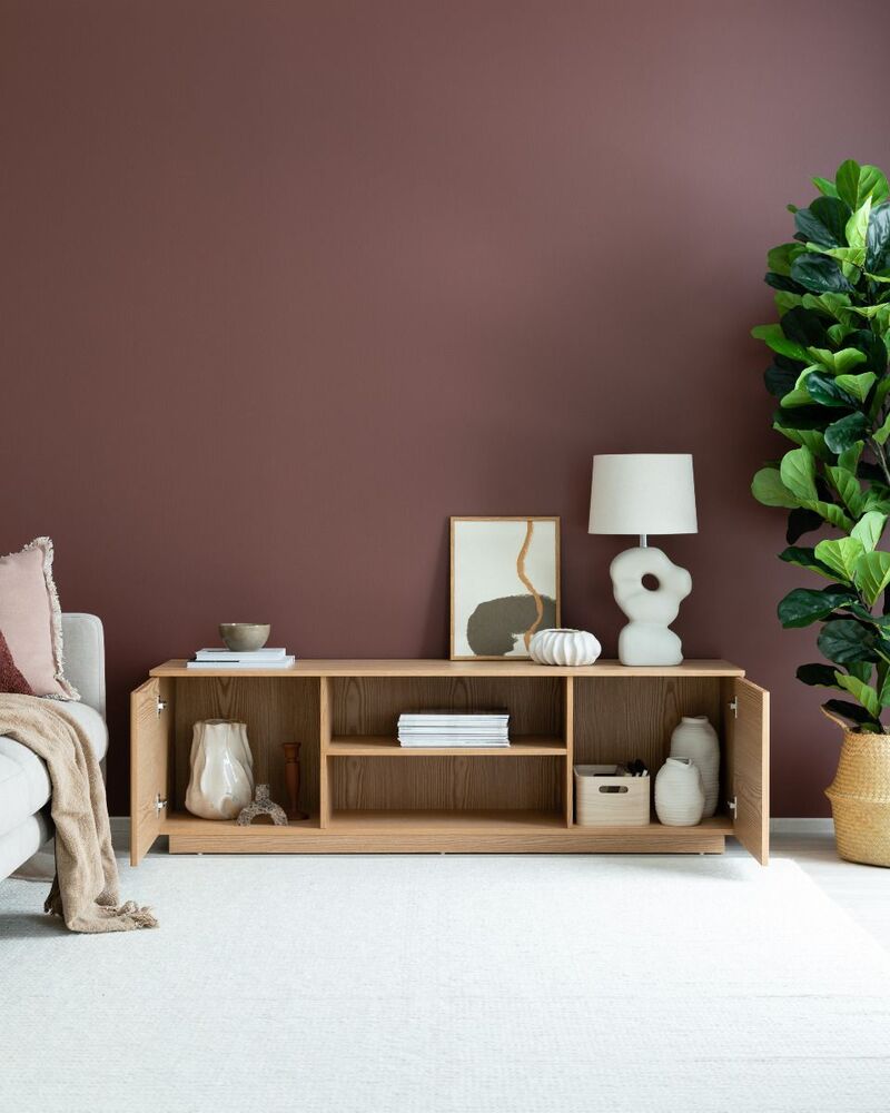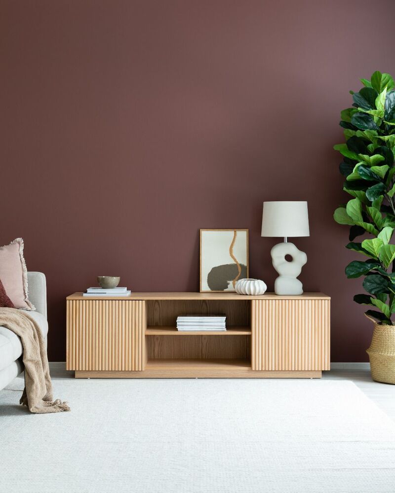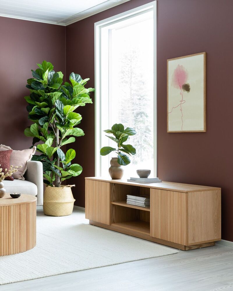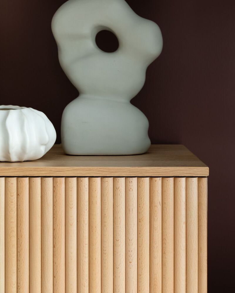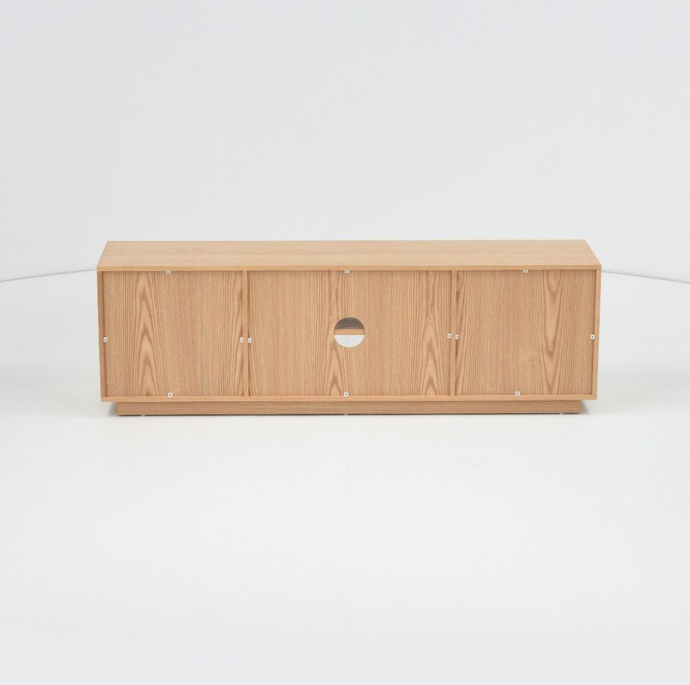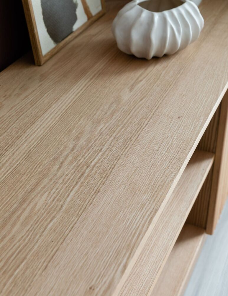 Upea, luonnonvärinen Verso tv-taso, jossa on kaksi kaappia sekä avohyllyt. Tv-tason runko on mdf-levyä ja tammiviilua ja sen ovet on koristeltu pyökkirimoilla.