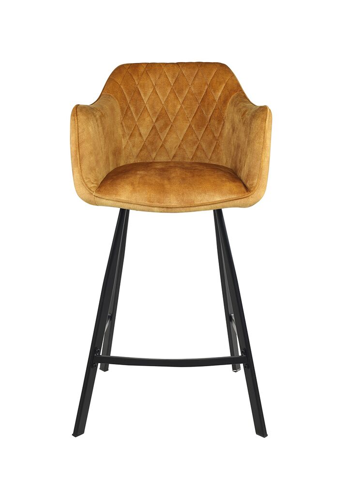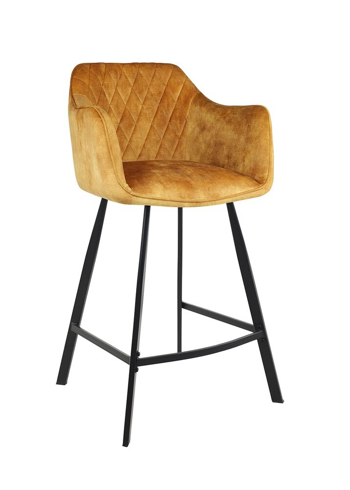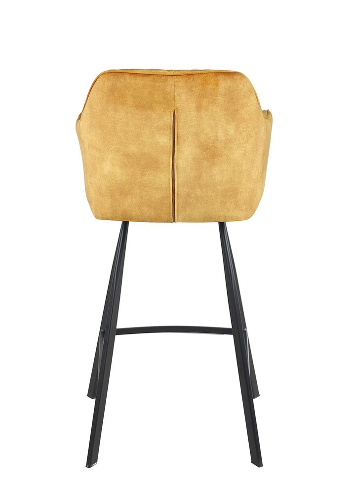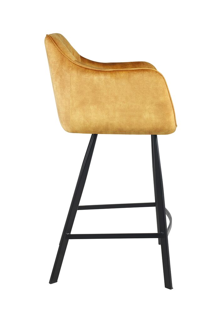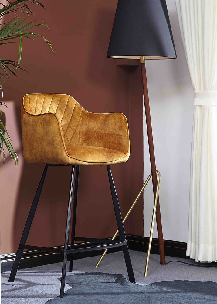 Tämä elegantti baarituoli yhdistää ylellisen samettiverhoilun ja modernin metallirakenteen näyttäväksi kokonaisuudeksi. Kullanvärinen samettipinta tuo sisustukseen pehmeyttä ja arvokasta ilmettä, kun taas mustaksi jauhemaalattu metallijalka luo tyylikästä kontrastia ja varmistaa tukevan rakenteen.