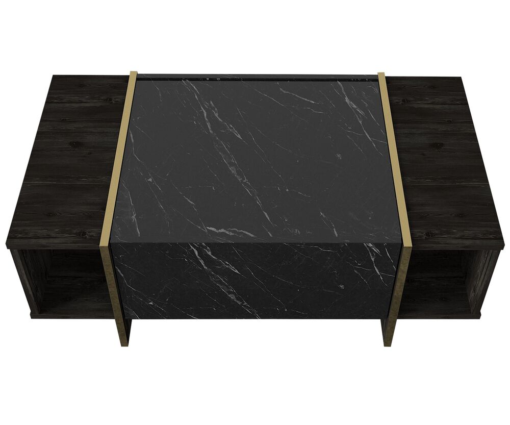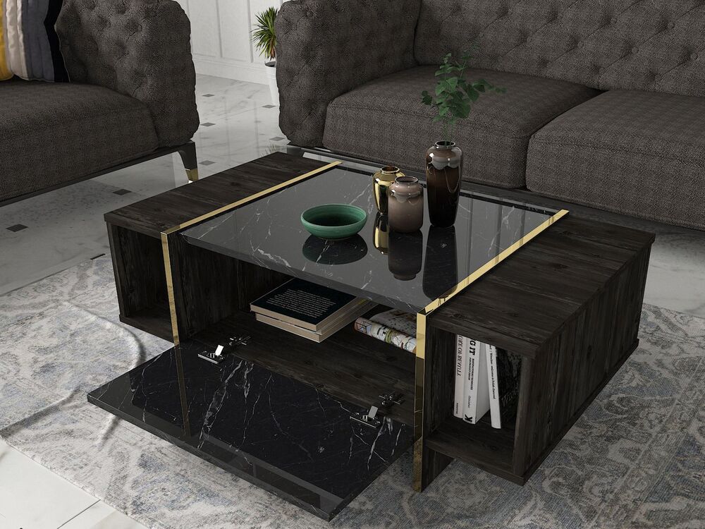 Veyron sohvapöydässä on kippioven takana runsaasti säilytystilaa. Tyylikäs musta marmoripintainen kuvionti sopii moderniin sisustukseen