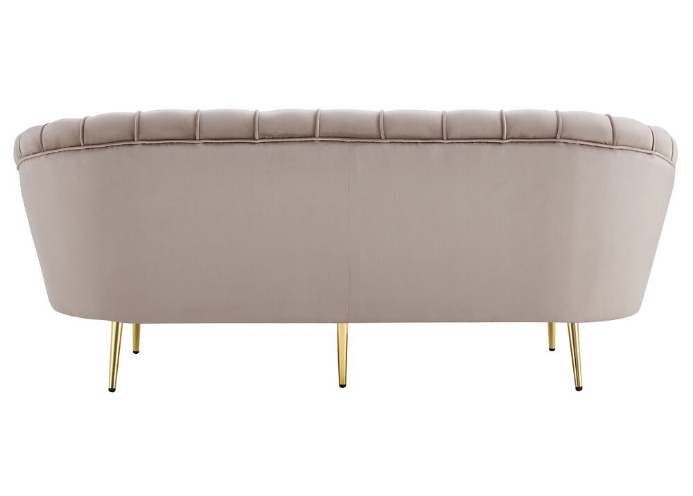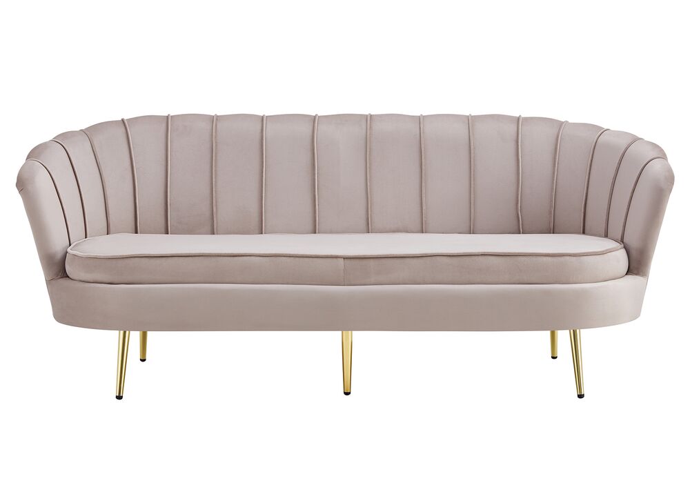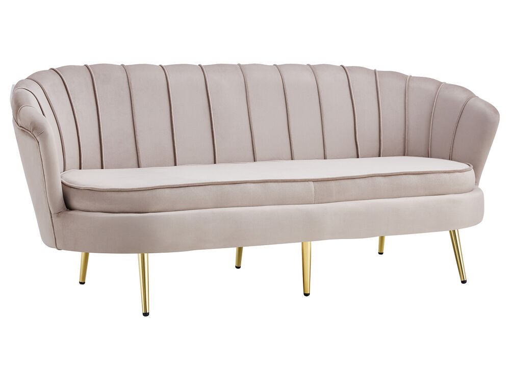 Tyylikäs beige samettisohva kultaisilla jaloilla