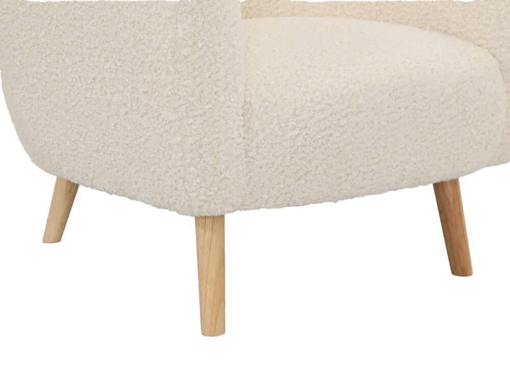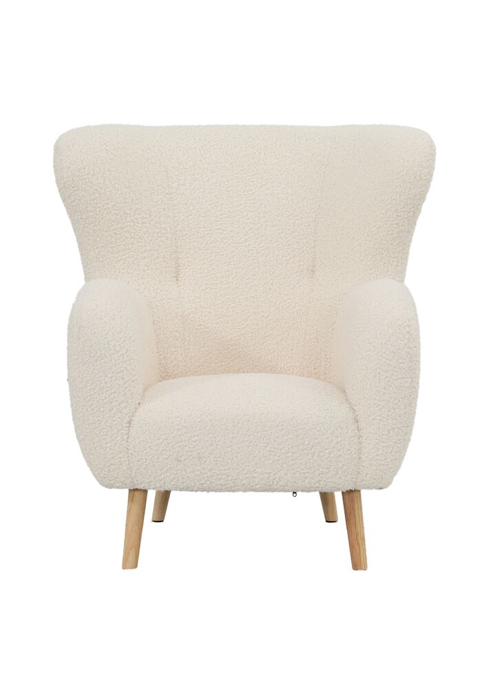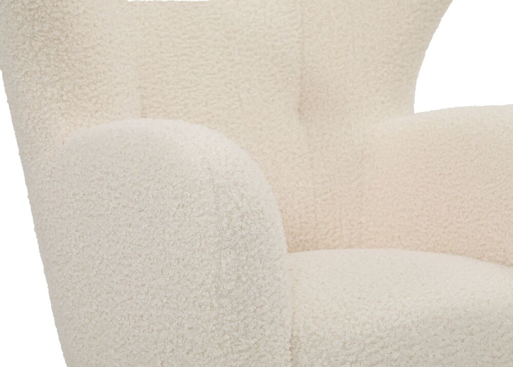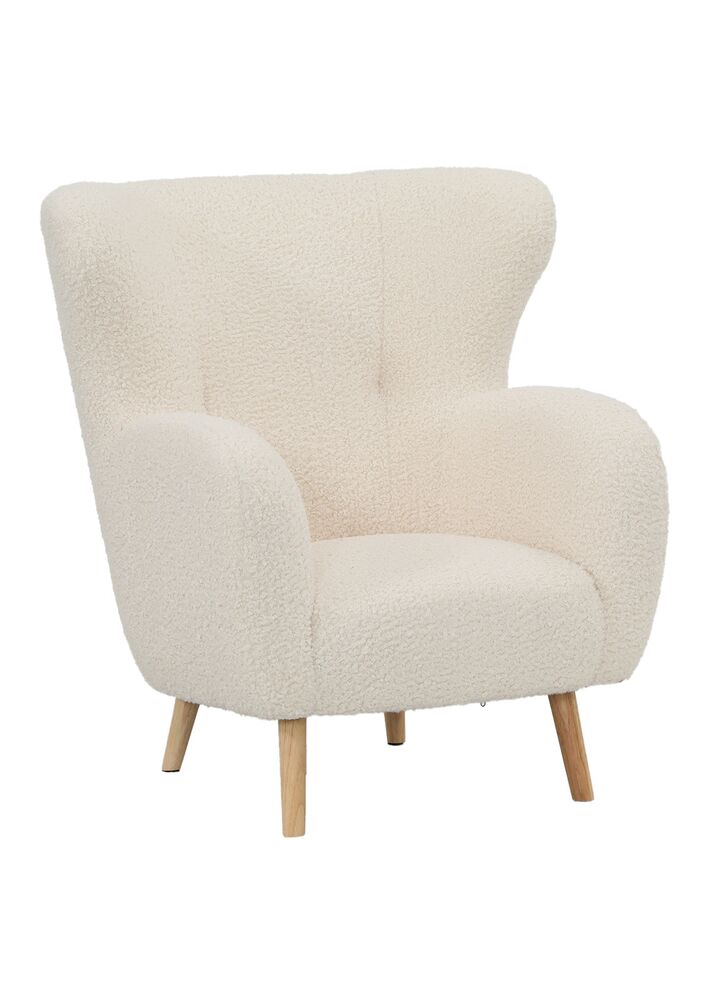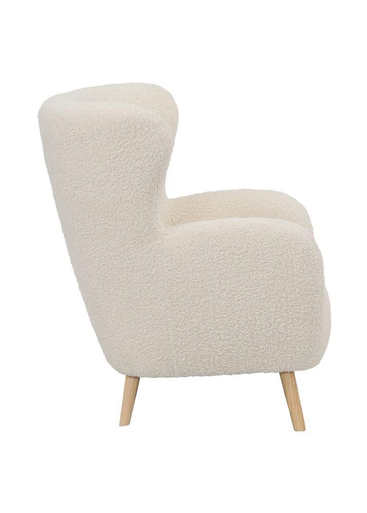 Näyttävä luonnonvalkoisen värinen lepotuoli. Runko massiivipuuta. Verhoilumateriaali on ihanan pehmeä teddymäinen Vilsund huonekalukangas kangas.