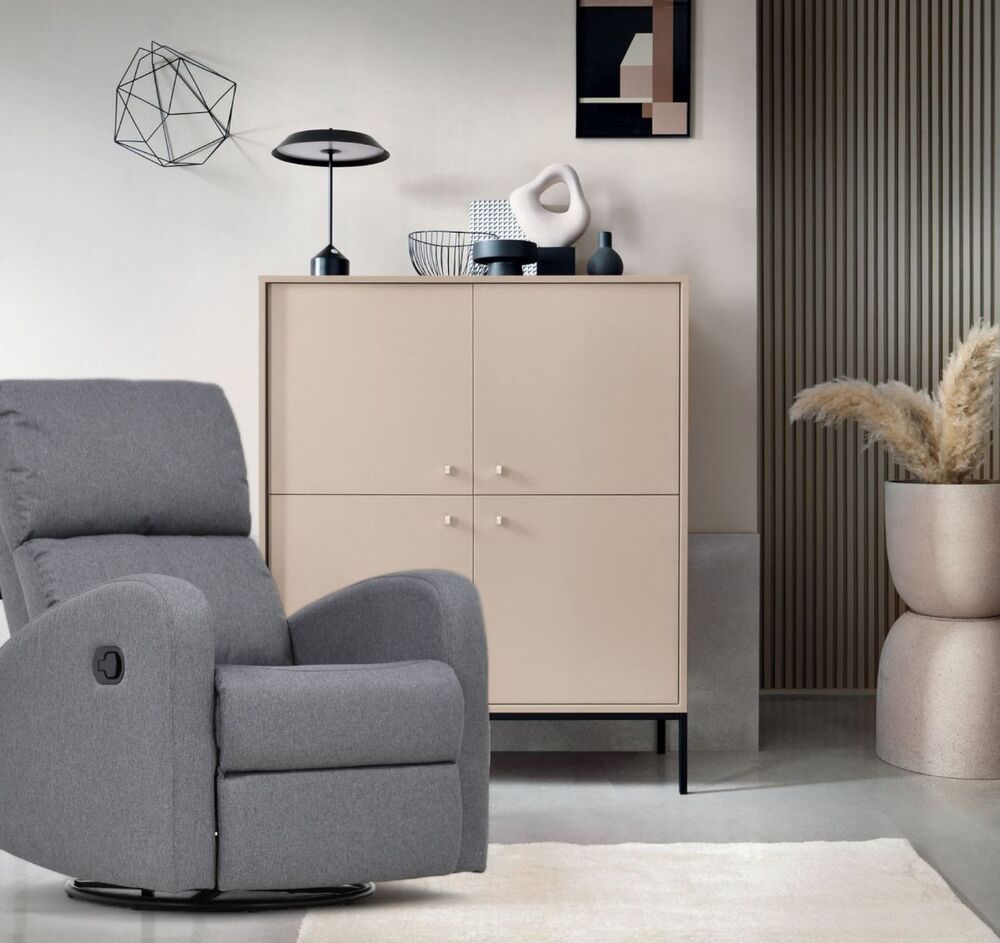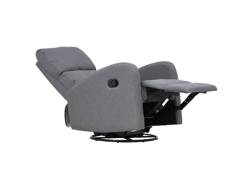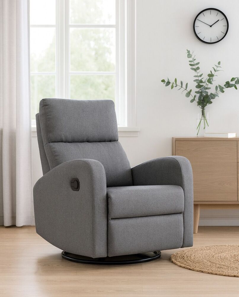Kaunis ja selkeälinjainen harmaa Bell-mekanismituoli. Tuolin mekanismin avulla saa selkänojan kallistettua lepoasentoon ja nostettua jalkatuen ylös. Tämän lisäksi tuoli on myös pyörivä sekä keinuva. Tuolin runko on puuta ja vaneria. Tuoli on verhoiltu kestävällä harmaalla Malmo-kankaalla (Davis Fabrics, Malmo-kangas sävy 95, Martindale 25000-30000, Pilling 5). Istuintyynyjen täytteenä on vaahtomuovia ja kuituvanua.