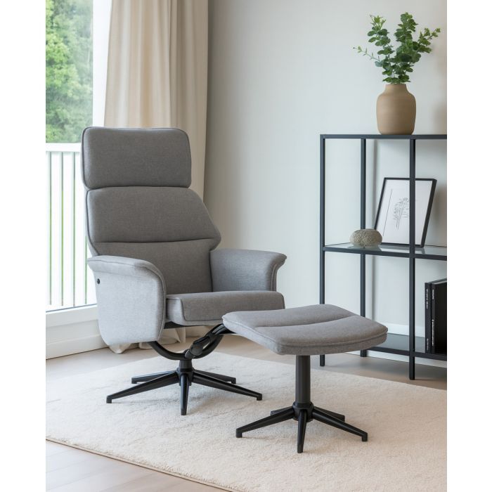 Tyylikäs ja kauniisti muotoiltu harmaa Vega-nojatuoli, jossa on erittäin hyvä istumamukavuus. Tuolissa on pyörivä mekanismi ja korkeussäädettävä niskatuki sekä mukana tuleva jalkarahi. Tuolin saa lepoasentoon kallistamalla selkänojaa ja samalla istuin työntyy eteenpäin. Tuolin sekä rahin rungot ovat puuta ja metallia. Tuolin istuin ja selkänoja ovat vaahtomuovia ja istuimessa on No-Zag-jousitus. Tuoli ja rahi on verhoiltu harmaalla Adda-kankaalla (100% polyesteri)