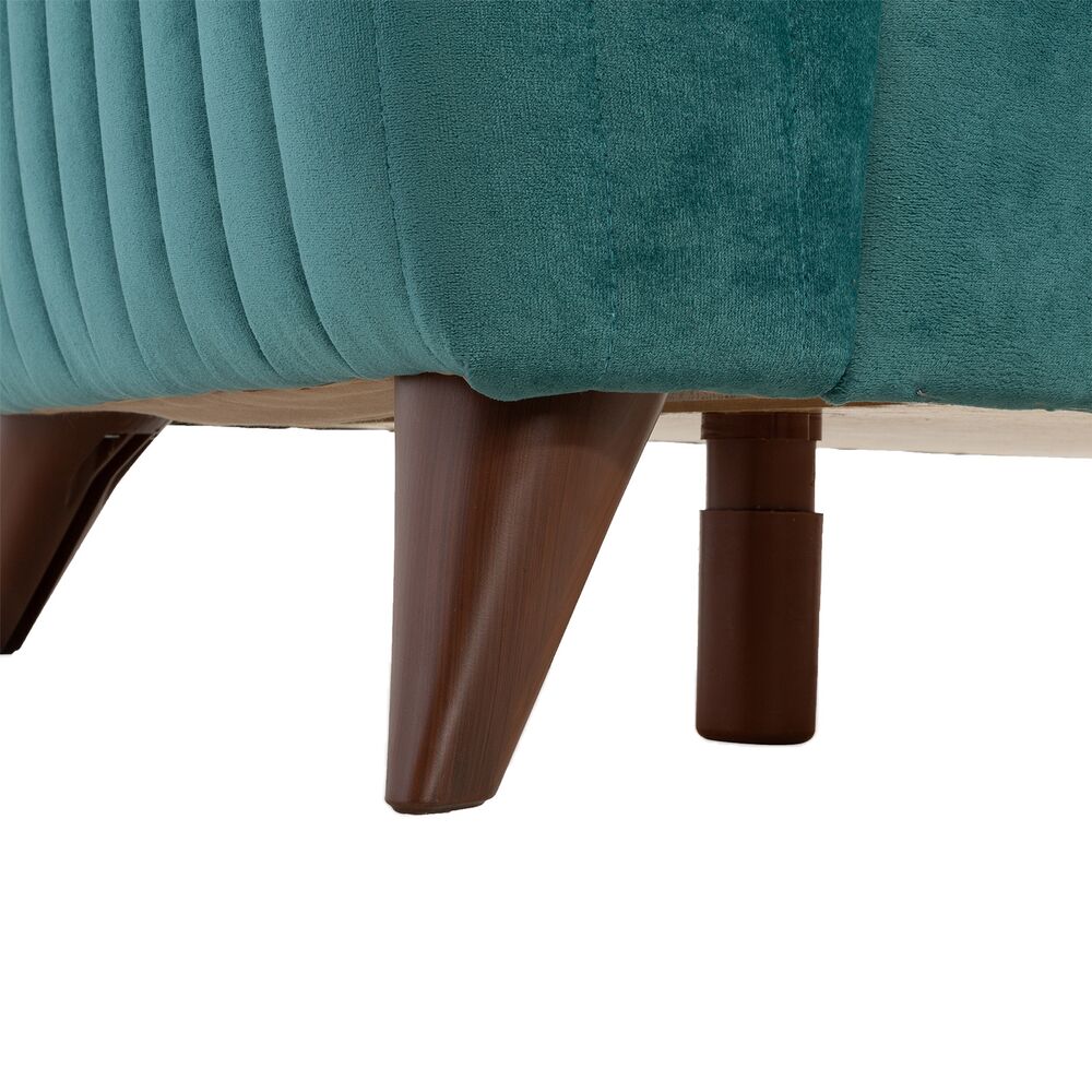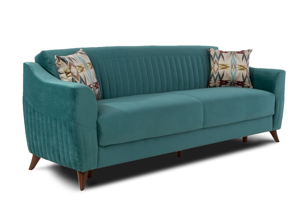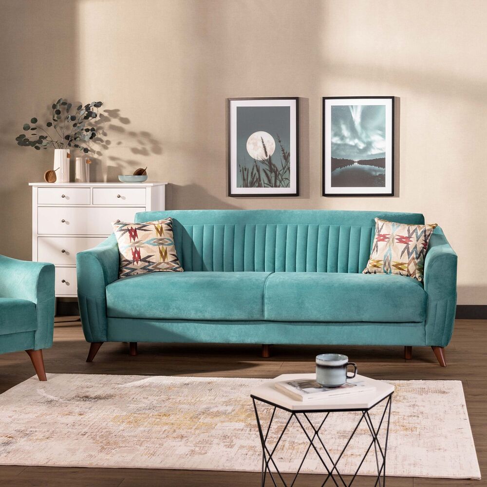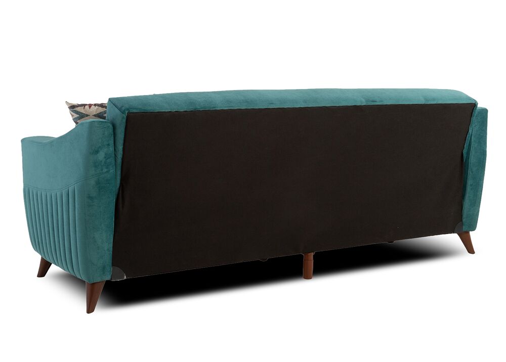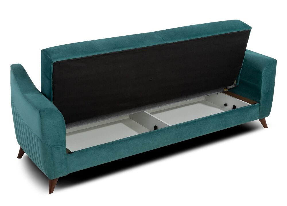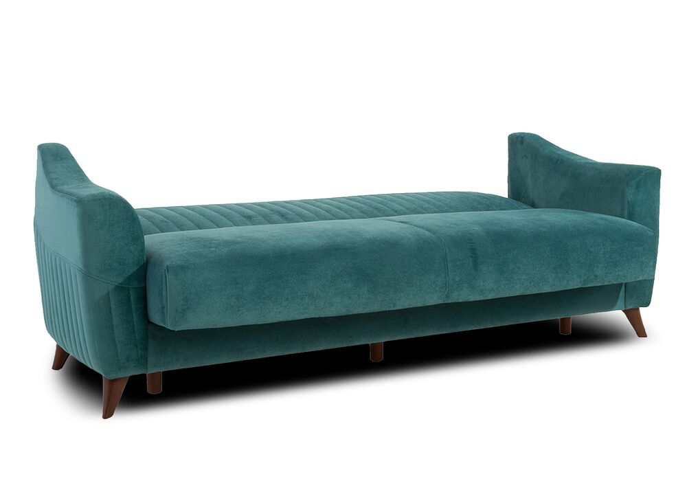 TRUVA-vuodesohva yhdistää retrohenkisen muotoilun ja käytännöllisen toiminnallisuuden. Samettinen merivihreä verhoilu tuo sisustukseen raikkautta ja pehmeyttä, kun taas korkeat jalat antavat sohvalle kevyen ja ilmavan ilmeen.