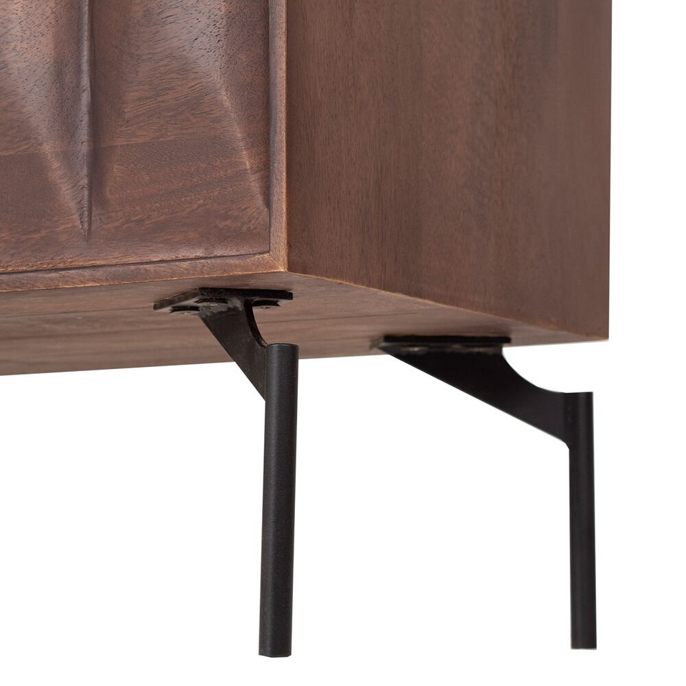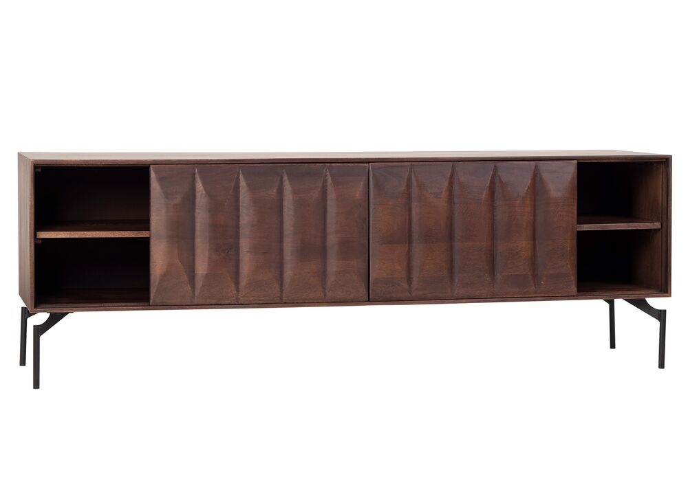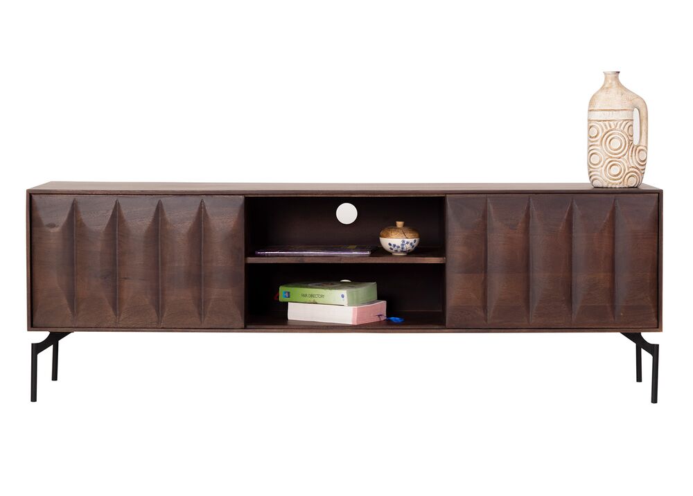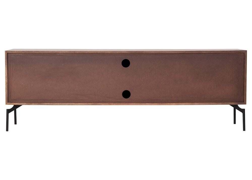 Tämä 160 cm leveä TV-taso yhdistää näyttävän mango-puun ja modernit metallijalat tyylikkääksi kokonaisuudeksi. Lämmin pähkinän sävy tuo sisustukseen syvyyttä ja luonnollista ilmettä, kun taas mustat metallijalat luovat kauniin kontrastin.