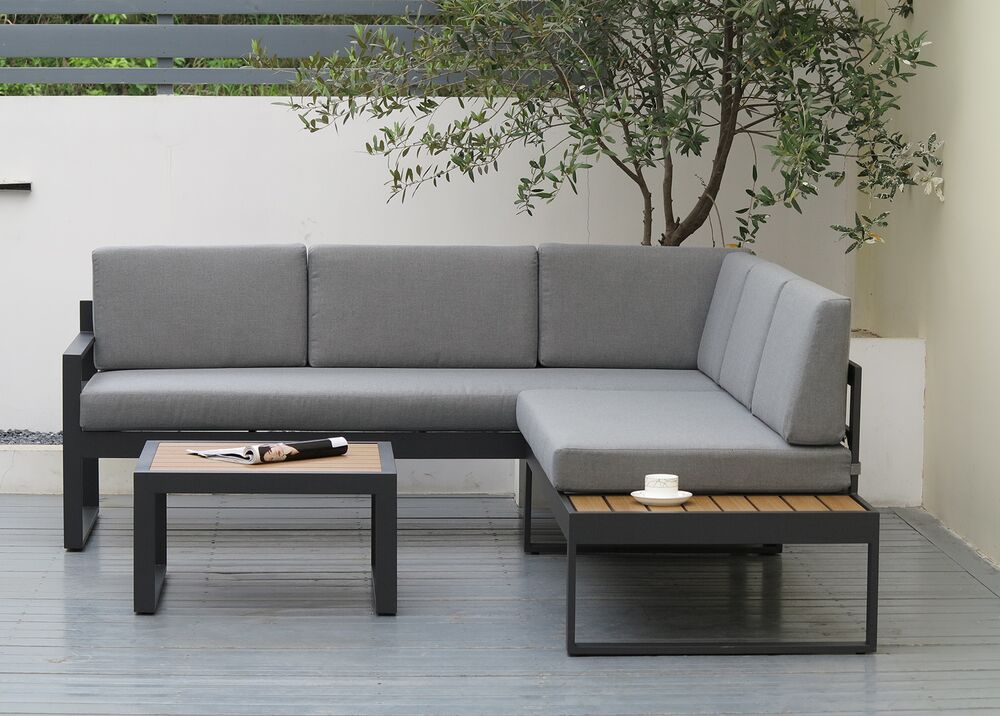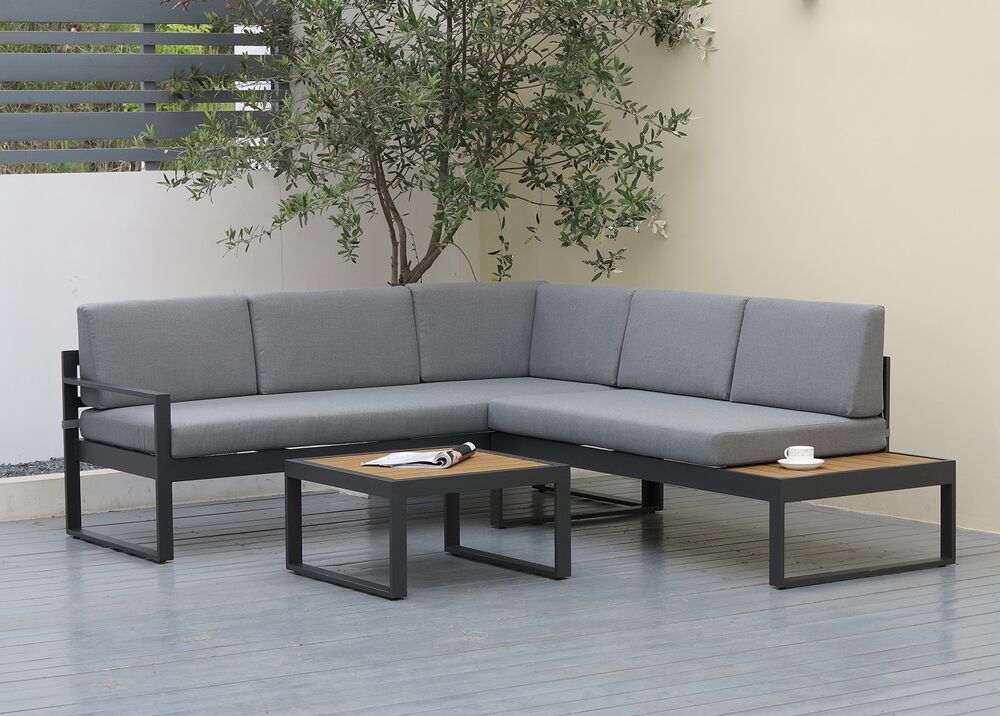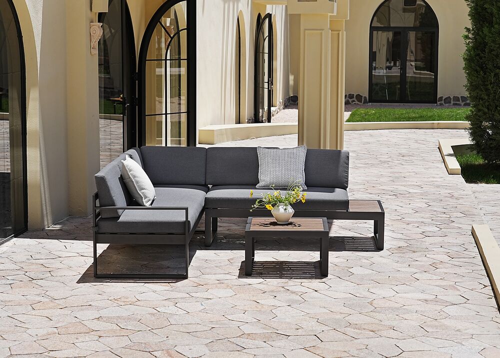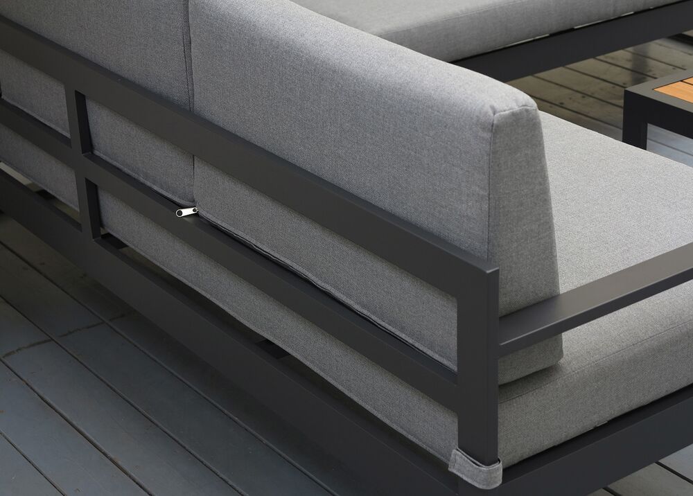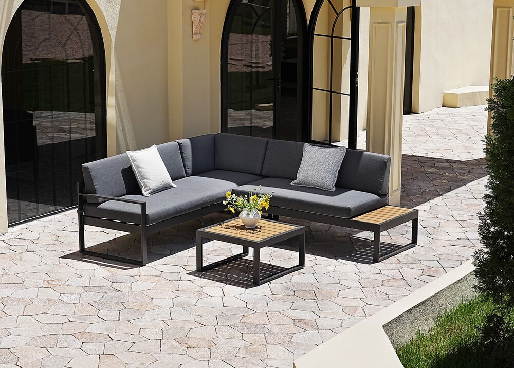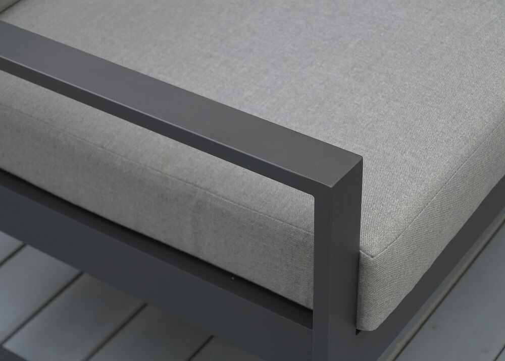 FINCA-kokonaisuus yhdistää minimalistisen muotoilun ja käytännölliset materiaalit, luoden terassille selkeän ja modernin oleskelualueen. Tummanharmaa runko ja kangas muodostavat yhtenäisen, elegantin kokonaisuuden, jota polywood-yksityiskohdat tuovat lämpöä.