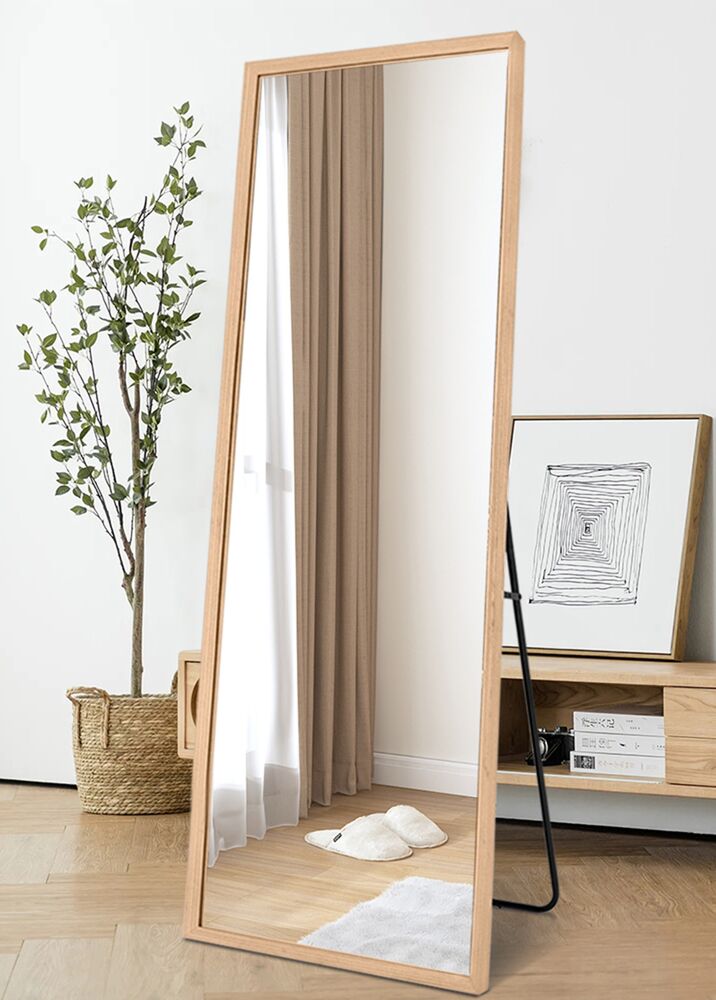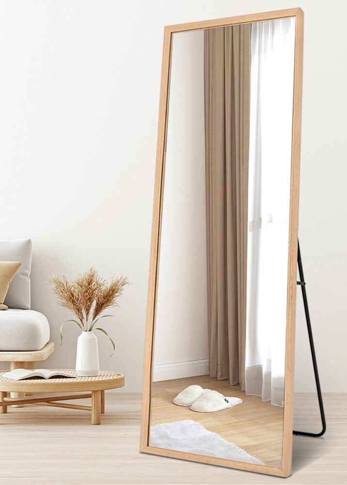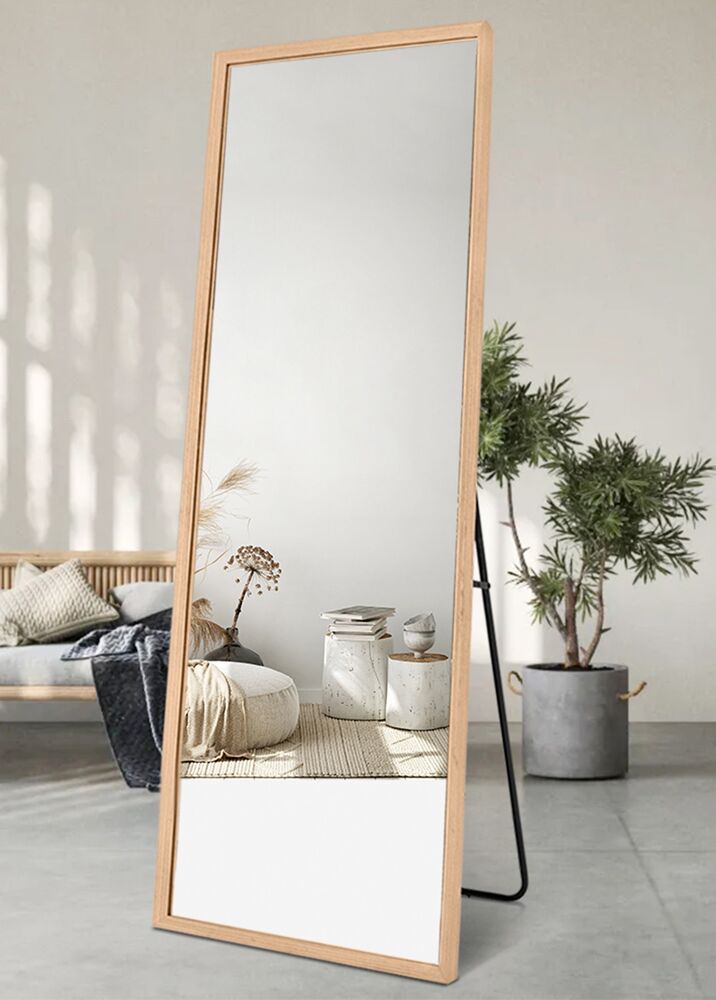 Iso ja tyylikäs Maluku-vartalopeili puunvärisillä kehyksillä. Peilin voi sijoittaa lattialle tukijalan avulla. Peilin leveys on 60 cm, syvyys 3 cm ja korkeus 165 cm. Kehyksen leveys 22mm