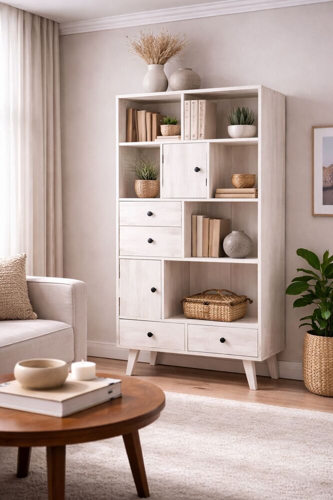 Kaunis massiviipuinen vintage henkinen kirjahylly joka maalattu antiikinvalkoiseksi, josta puunkuvio näkyy kauniisti läpi.
