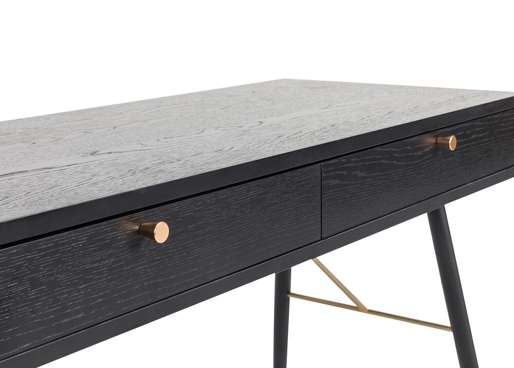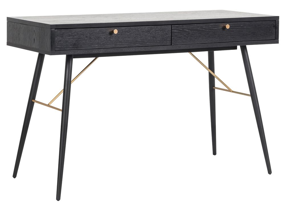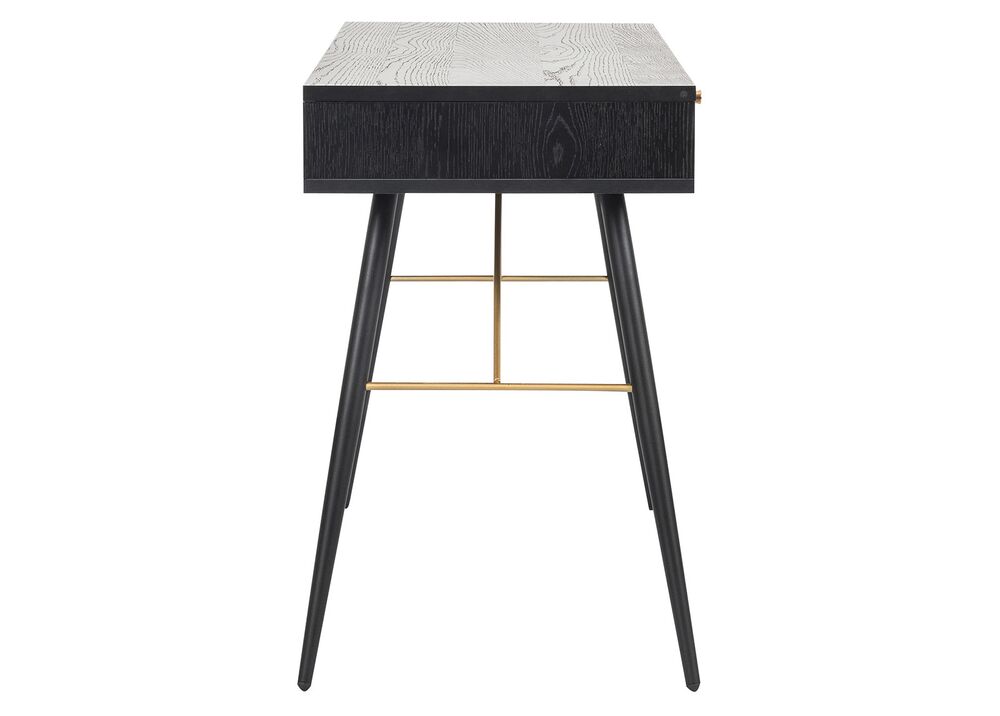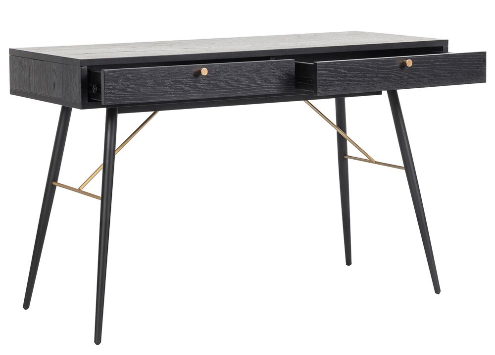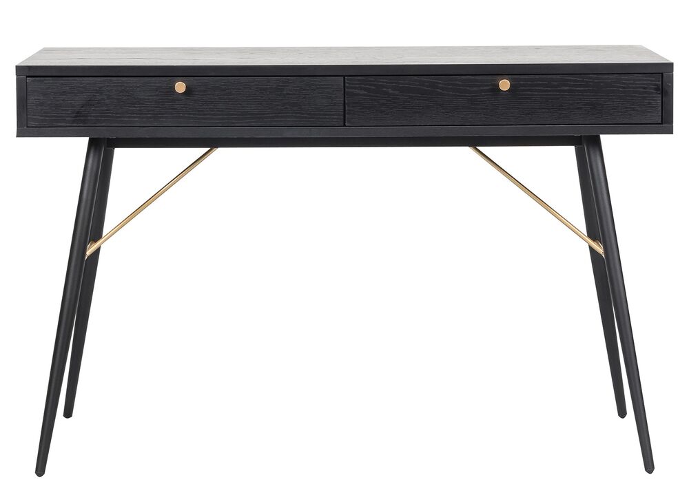 Tyylikäs musta työpöytä joka toimii myös eteispöytänä. Kullanväriset metalliosat tuovat tuotteeseen tyylikkyyttä