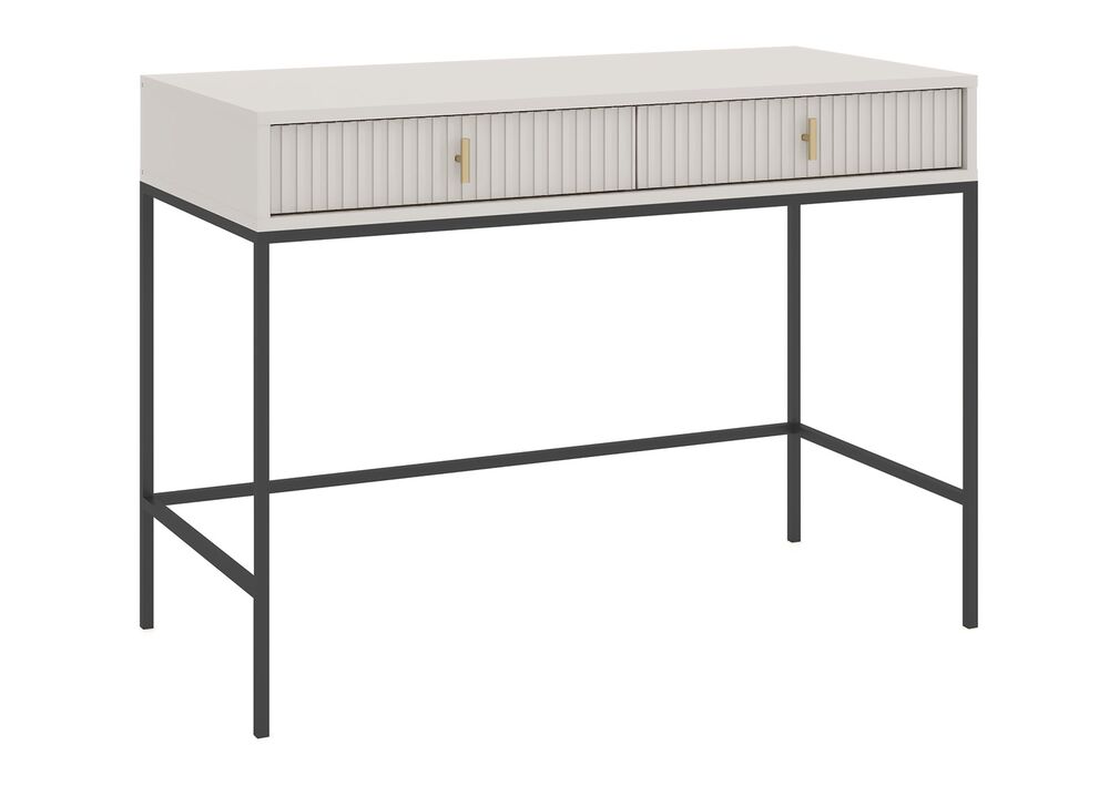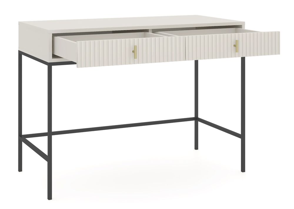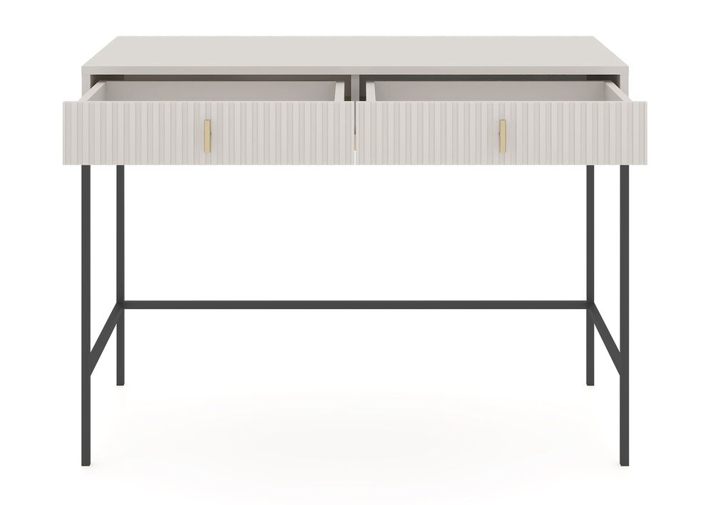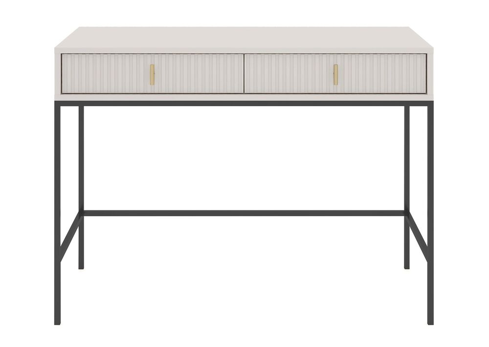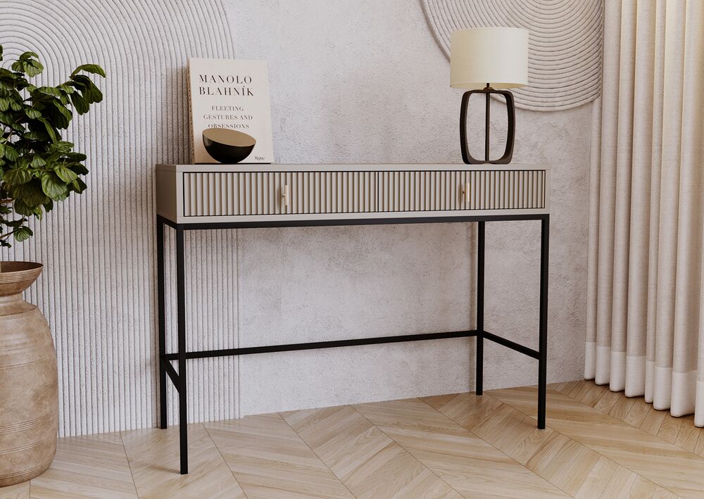 Yksinkertaisuus, joka puhuttelee – MAGGIORE-kirjoituspöytä yhdistää minimalistisen muotoilun ja näyttävät yksityiskohdat. Sen kauniisti uritettu etupaneeli ja kontrastinen metallirunko luovat harmonisen tasapainon. Pöytä on suunniteltu niille, jotka arvostavat yhtä aikaa sekä visuaalista ilmettä että käytännöllisyyttä.