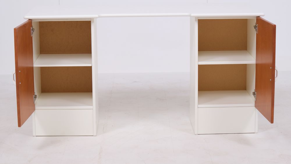 Kotimainen Niko kirjoituspöytä. Laatikoston rungot luonnonvalkoiset, ovet petsattu kirsikan sävyyn ja kansilevy valkoinen.