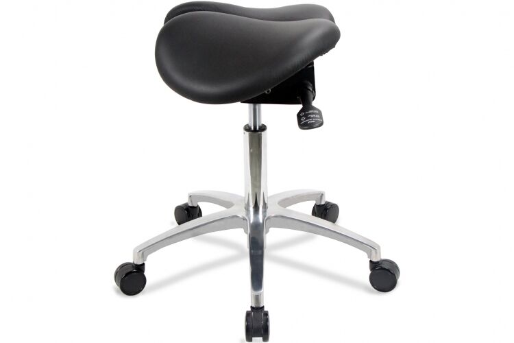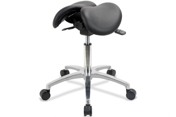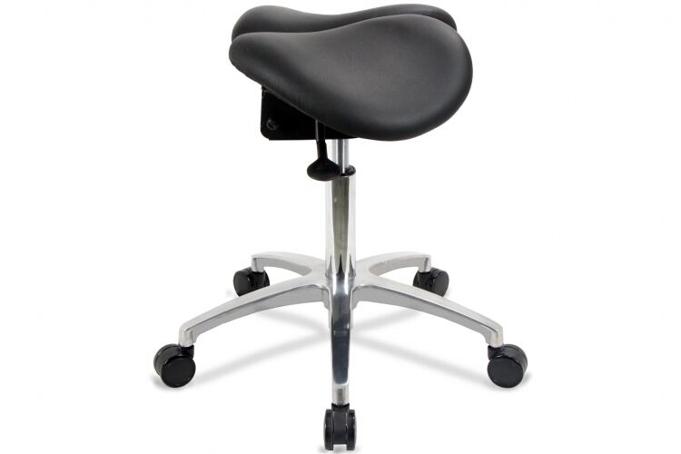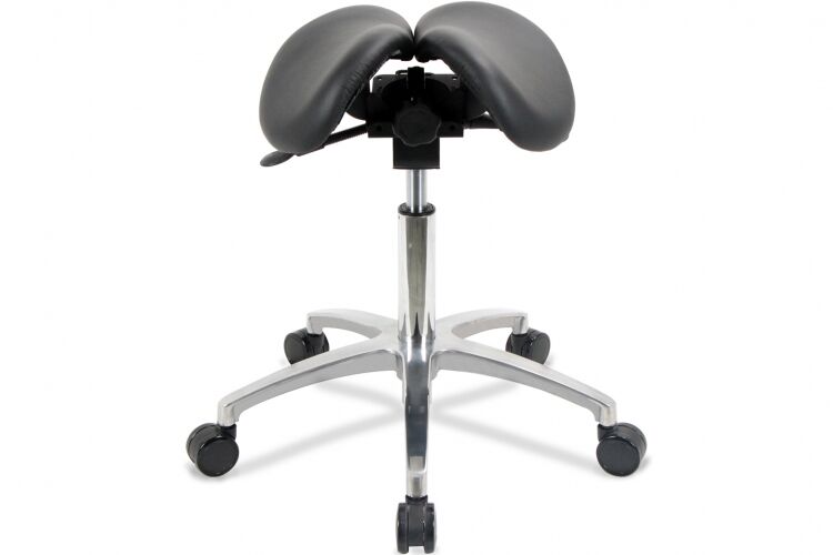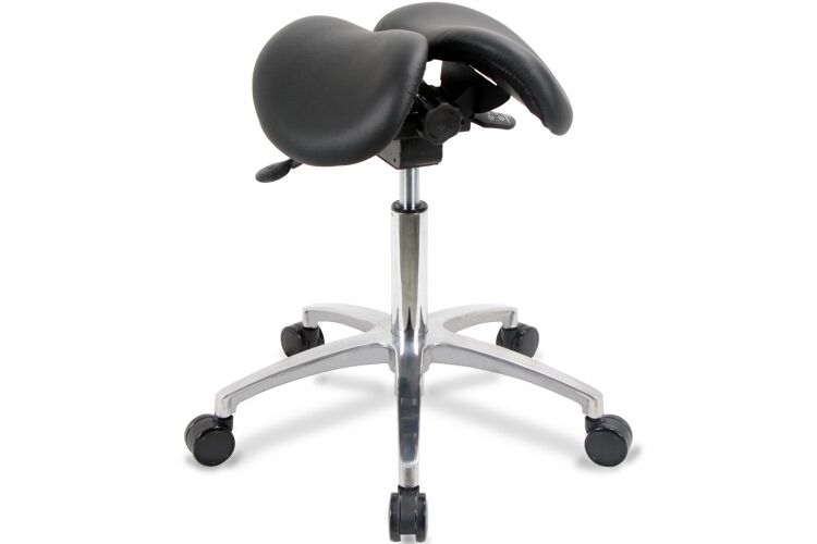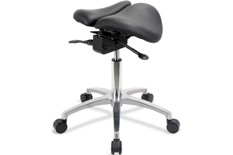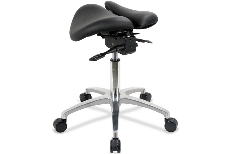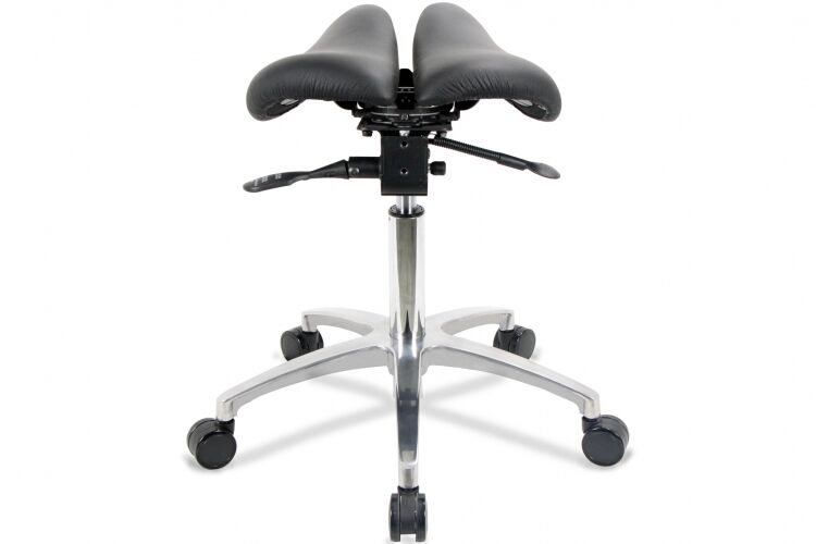 Satulatuoli kaksioisaillla istuimella istuimen leveys on säädettävä. Kallistettavan istuimen pohjamateriaali on metallia, joka on pehmustettu ja verhoiltu aidolla nahalla. Jalkaristikko on alumiinia ja siinä on kovalle lattialle soveltuvat pyörät.